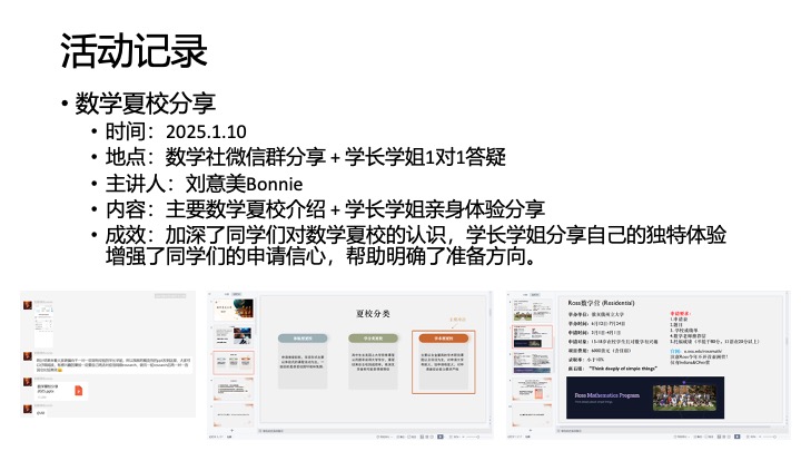 以下列出的是数学社比较重要的成员会议,一般在数学社中的决定都是由数学社领导层微信群进行讨论的。为了能够培养本届数学社核心成员,上一届数学社成员也在群聊中为我们提供许多宝贵的经验。数学社日常的活动规划讨论确保了我们能有计划地举办各类活动以及统筹社内的资金。AAAA