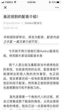 2) 线上介绍配音:9月15日在公众号上发布一篇关于配音的简介以及感悟的原创文章