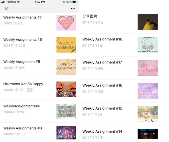 3) 坚持每周任务推送:每周五在配音社公众号推送当周任务,通常为3个配音段子(图为部分公众号Weekly Assignments的截图)。节日会推送相应主题的配音段子。全年累计推送18篇Weekly Assignments,7篇其他类推文,共计25篇推送。