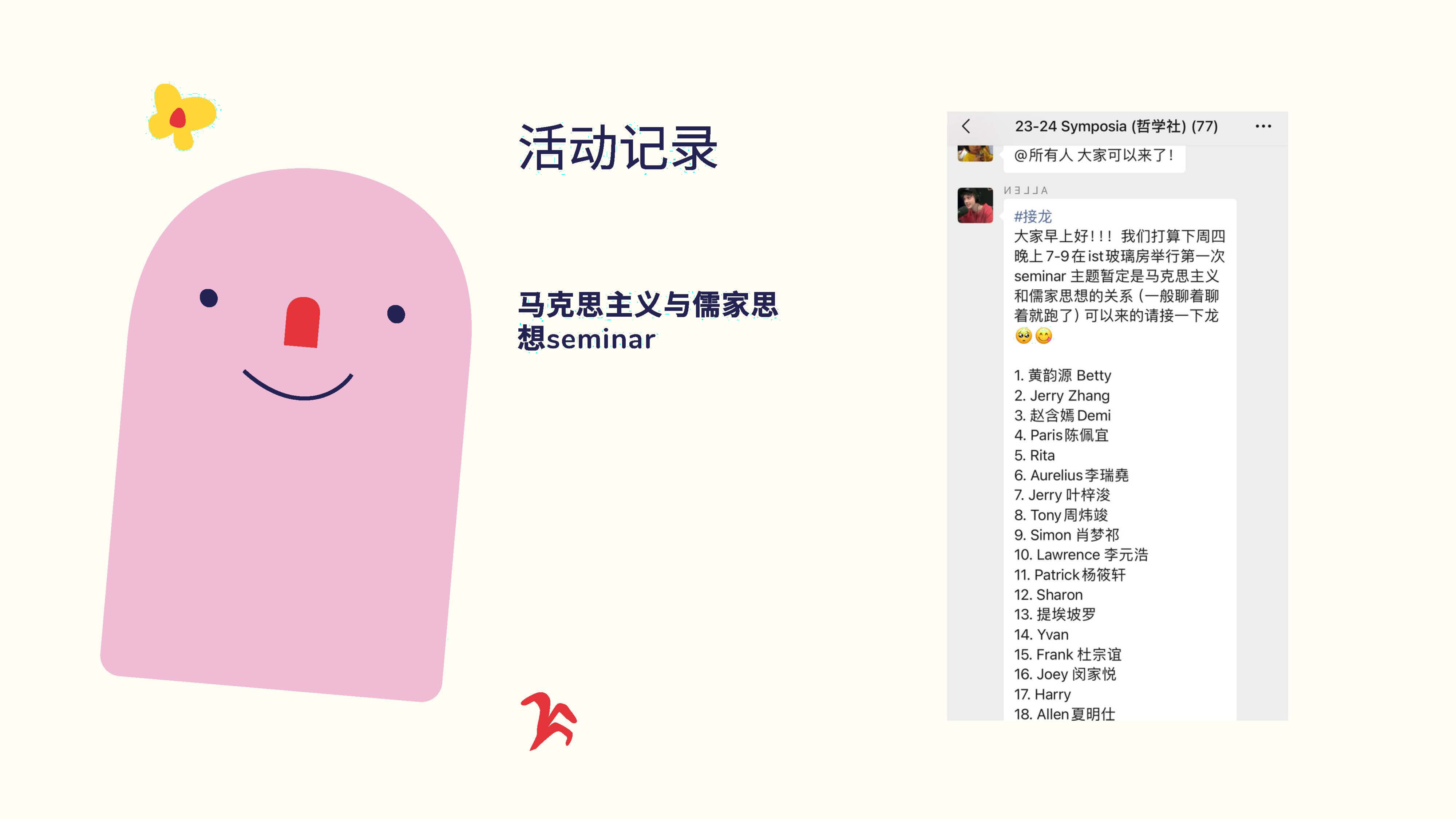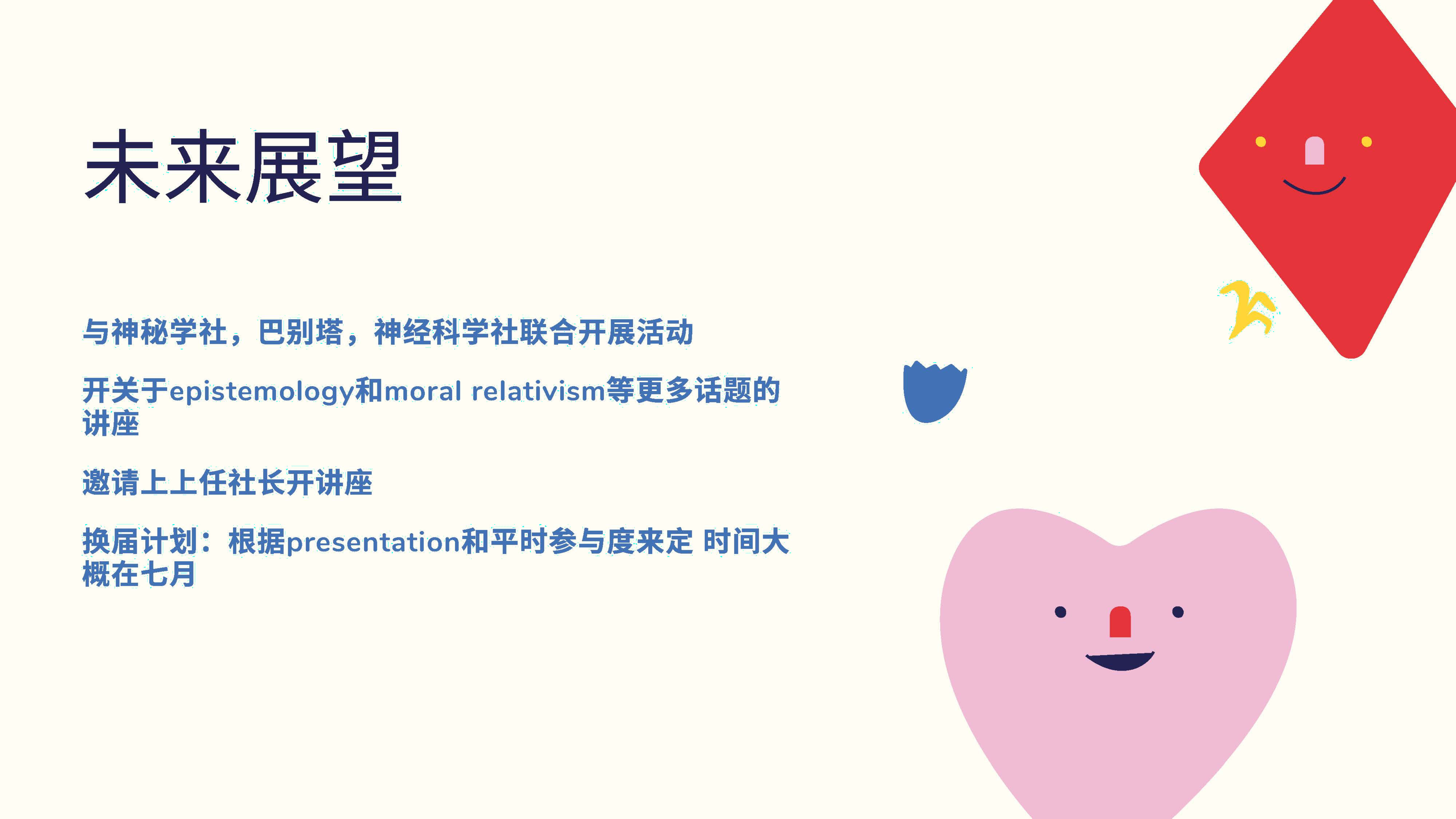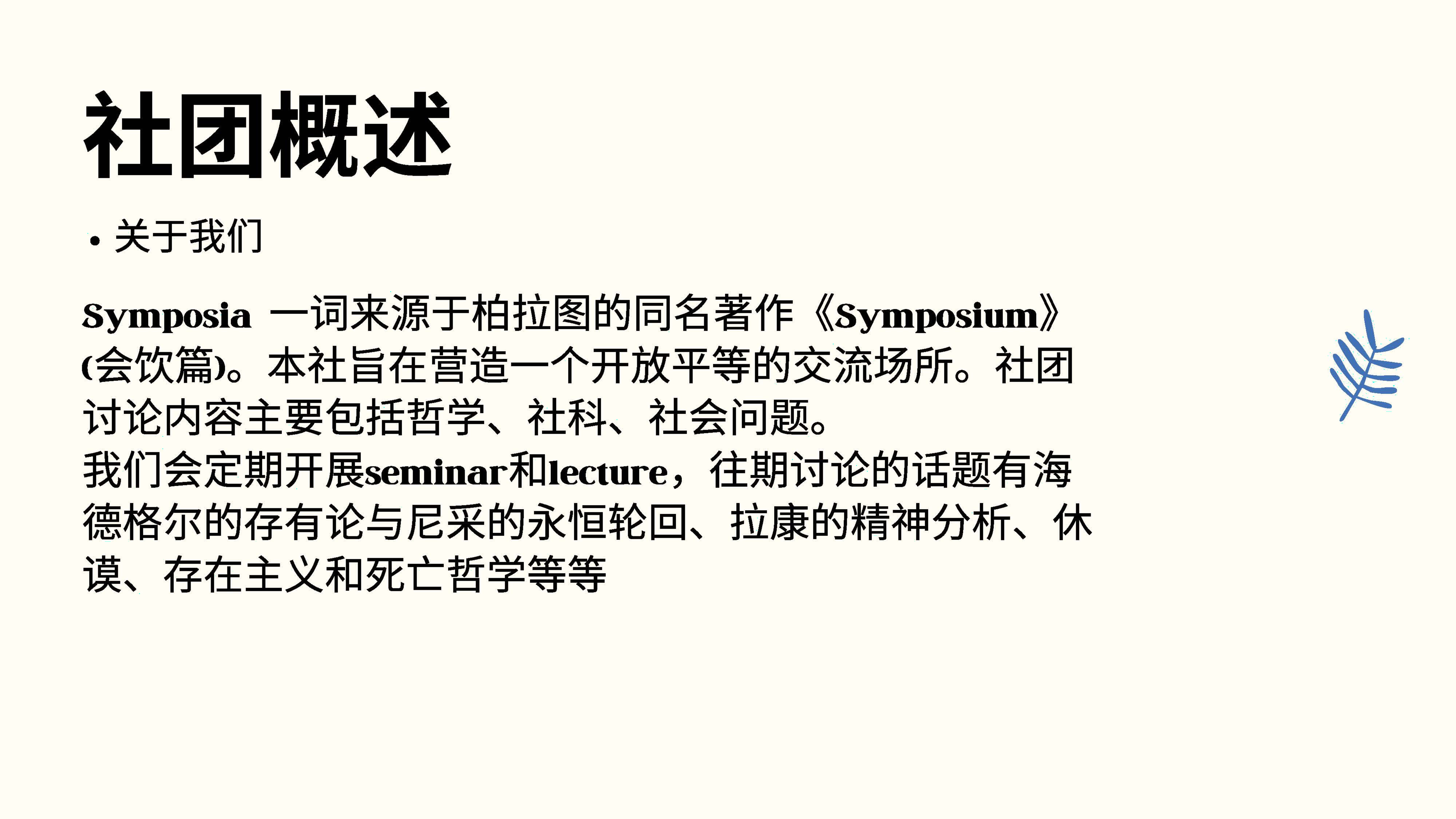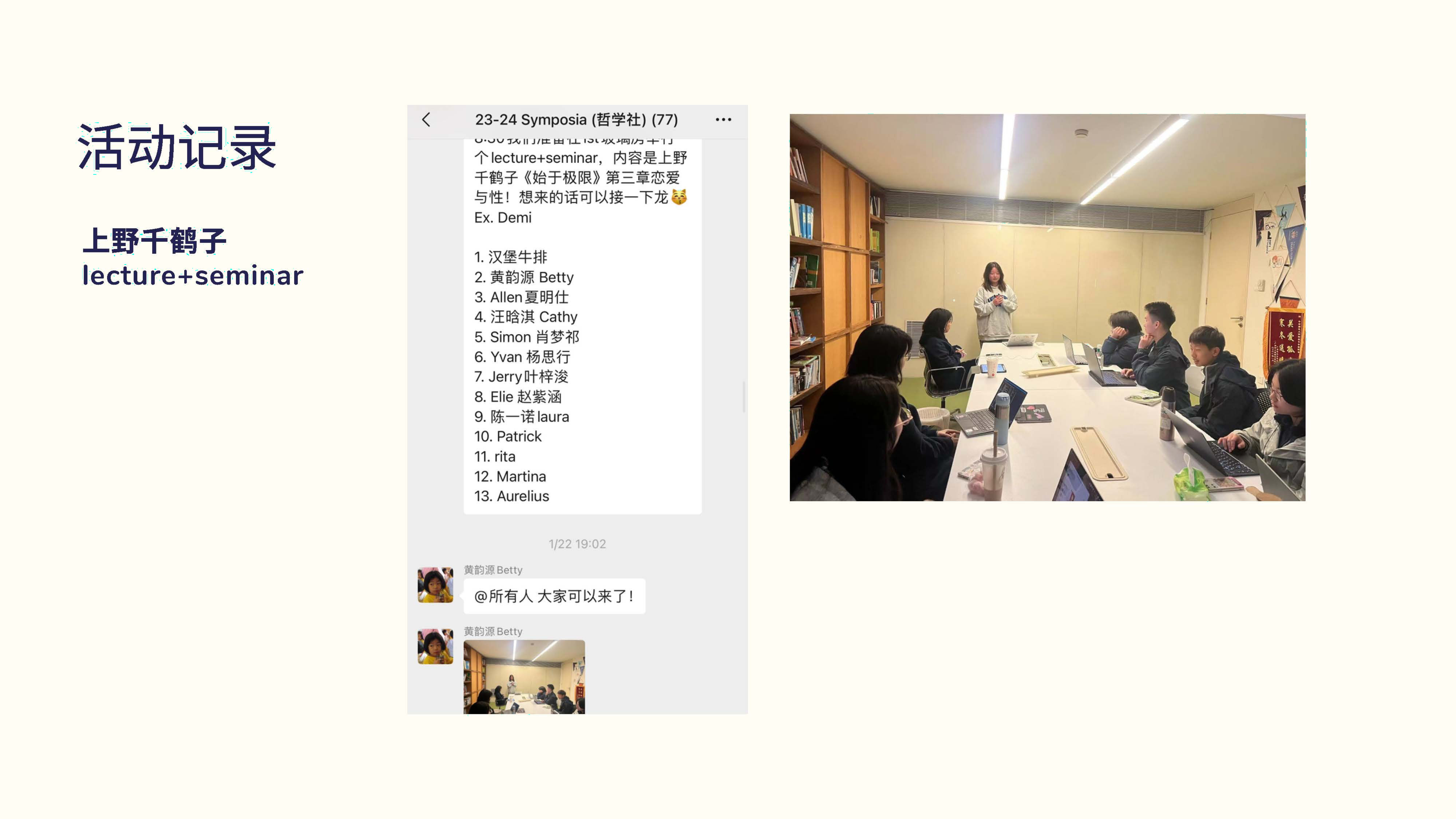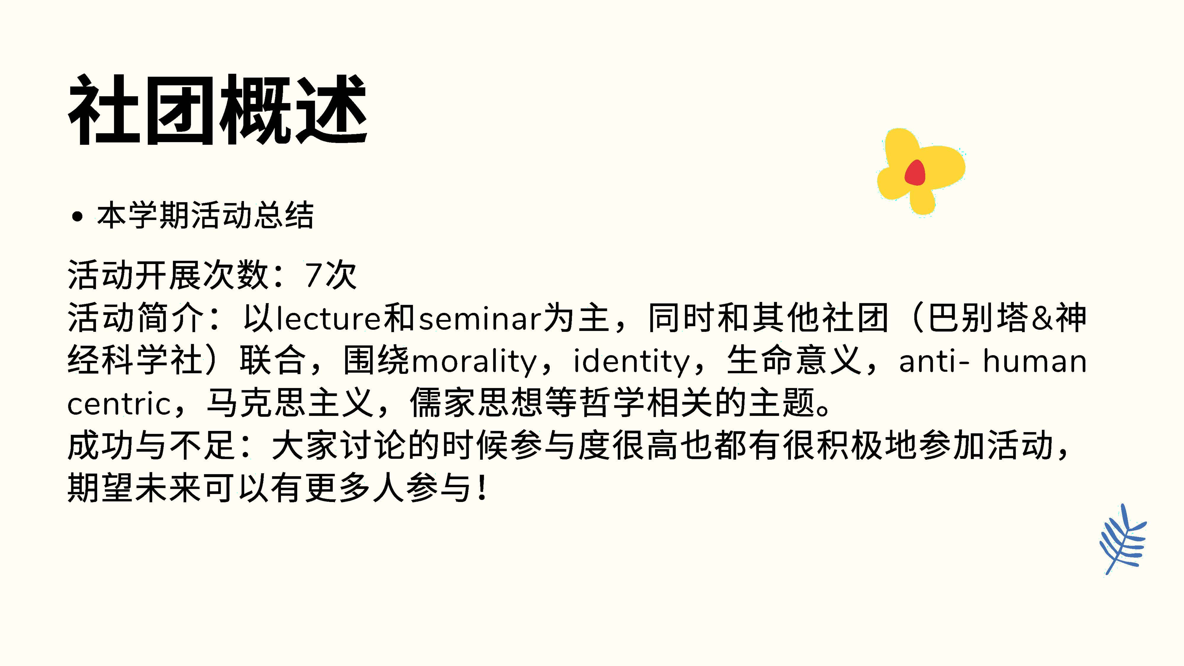 社团讨论内容主要包括哲学、社科、社会问题。本学期将 涉及的话题包括但不限于本体论,认识论,intro to philosophy,scientific philosophy(e.g. mathematics philosophy以及 是否科学价值无涉?);后现代,⻢克思主 义,消费主义以及精神分析;中国哲学(neo- confucianism);政治哲学/科学。