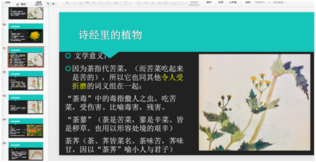 内容:介绍诗经中常见的5中花草植物:荇、荼、谖、黍、檀,和它们在古文中的代表意义、感情色彩。再联系到诗经中有关这些植物的诗句、背景、释义、主旨。时长30分钟。