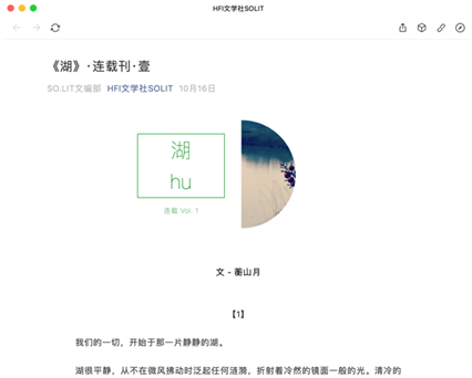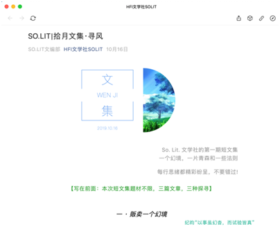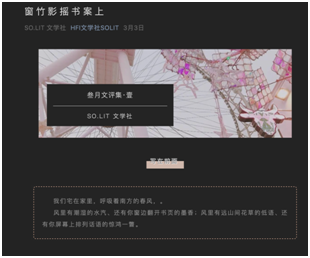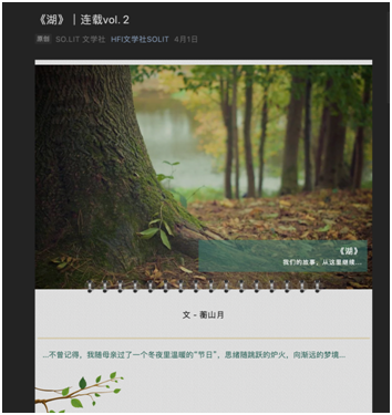 为了向本校,甚至外校同学宣传文学社各类的内容,与此同时为本社团文编部的成员提供文学创作的平台,本学年社团开设了社团公众号——HFI文学社SO.LIT。本学年的公众号由社长田睿琪和文编部部长吴越共同管理、审核。在本学年(尤其是因疫情的网课期间)当中,公众号多次发表推文,不仅鼓励社团成员进行定期的文学创作,而且能够填补线下活动诸如社课和读书会方面的受众局限性。