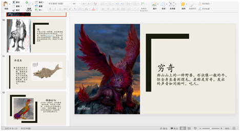 Content: Introduced the background of the Book of Mountains and Seas, a collection of ancient myths in China, including the meaning of several bizarre creatures in it: Luo Yu, Qiong Qi, Bo, Ran Yi Yu, Di Jiang, Sheng Yu. Then illustrated examples of citation to these creatures for their representation in other ancient literature.