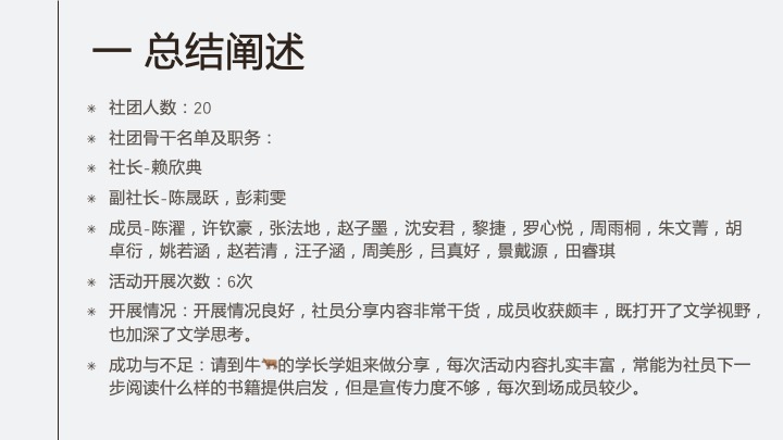 19-20学年的文学社社团活动主要分为三条线路:创作,学习与文学讨论。主题包括不同语言或文化背景的文学作品(主要以中英文的方式呈现)。考虑到文学以及文学普及对每个人来说的都有独特的意义,今年文学社的成员们从上述三个不同线路出发,应用公众号推文、讲座、讨论会三种不同呈现方式,举办了包容社团核心成员各人不同风格的,并且能够大部分社团成员文学兴趣,培养文学素养的活动。本学年中我们仍然有做得不足的地方,如对文学重要性的宣传不到位,管理方式有时松散,社团凝聚力还有待提高。因此文学社希望能在明年继续拓展活动办法与内容,招揽更多热爱文学创作,享受文学鉴赏,并乐于向更广泛的群体分享文学知识的忠实社员。