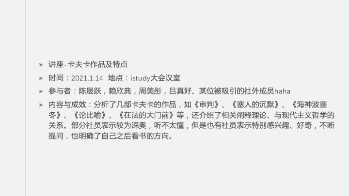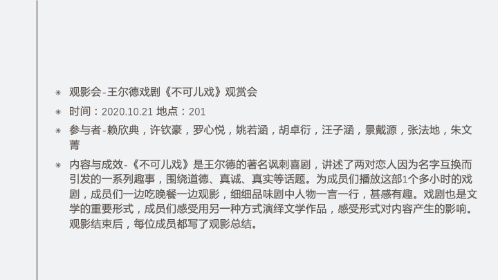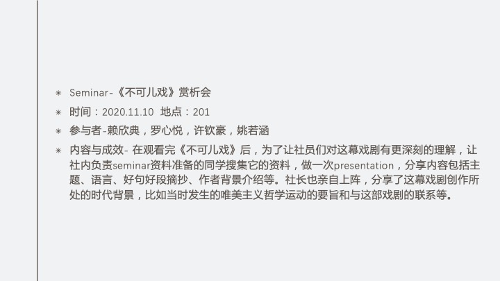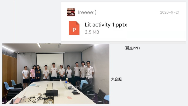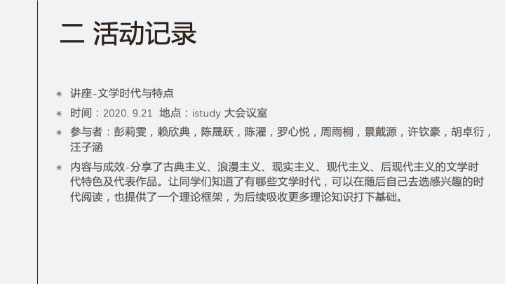 内容:介绍新社团SO.LIT文学社的内涵、理念、新学年活动计划、活动形式,随后进行新社团成员招新,时长20分钟。