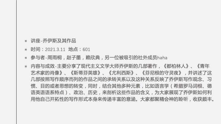Content: Introduce the background of the novel East of Eden, the main plot outline (brief introduction to unread club members), the implications behind the content, and the author's gist. It lasted about 20 minutes.
