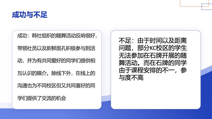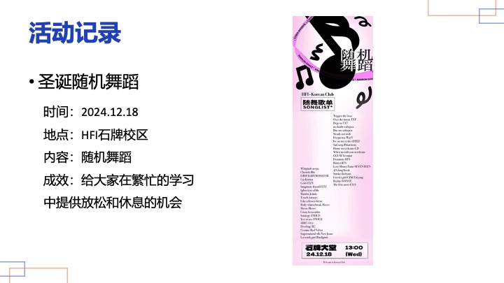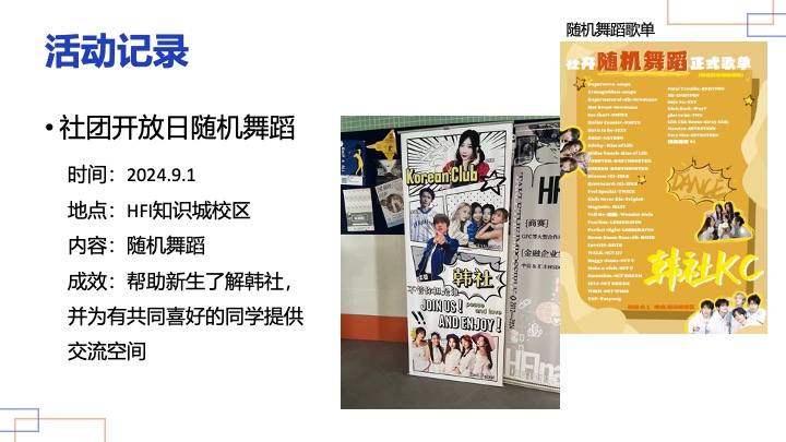 保持公众号更新 (内容包括:音乐视频/影视剧分析,介绍团体、每月歌单推送等);在校内定时做一些研讨会,定期组织K-POP随机舞蹈活动