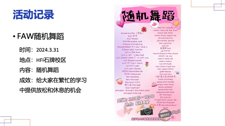 3. 组织社员参加了kpop随机舞蹈快闪活动,体验了韩国舞蹈。Organized club members to participate in Kpop random play dance in public. (A different one from the one before)