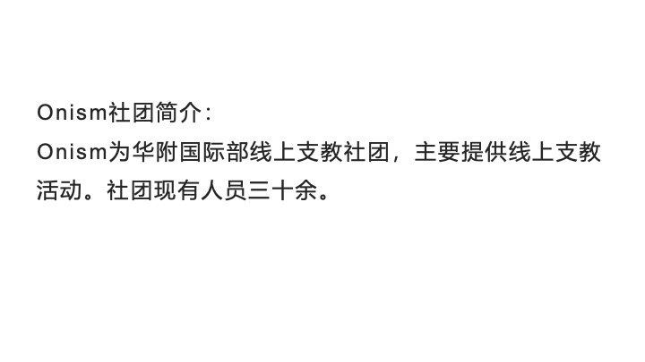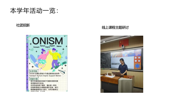ONISM一直以来为线上支教模式开展社团活动,一般支教对象为一所学校的部分学生.在2021暑假,ONISM创新开展了中小学生的WORKSHOP项目, 与支教方式不同, ONISM社员们带着周围的中小学生一起讨论社会热点、文化、历史等更深入的TOPIC,将英语的语言趣味传递给他们. ONISM后期会联合其他社团,开展更多的活动,并继续坚持线上支教。我们是公益支教的组织,主要为边远地区的小学生和初中生提供线上支援教育,内容包括但不限于新概念英语、中考英语和其他融合学科的实践活动。