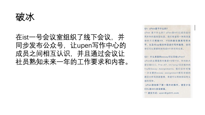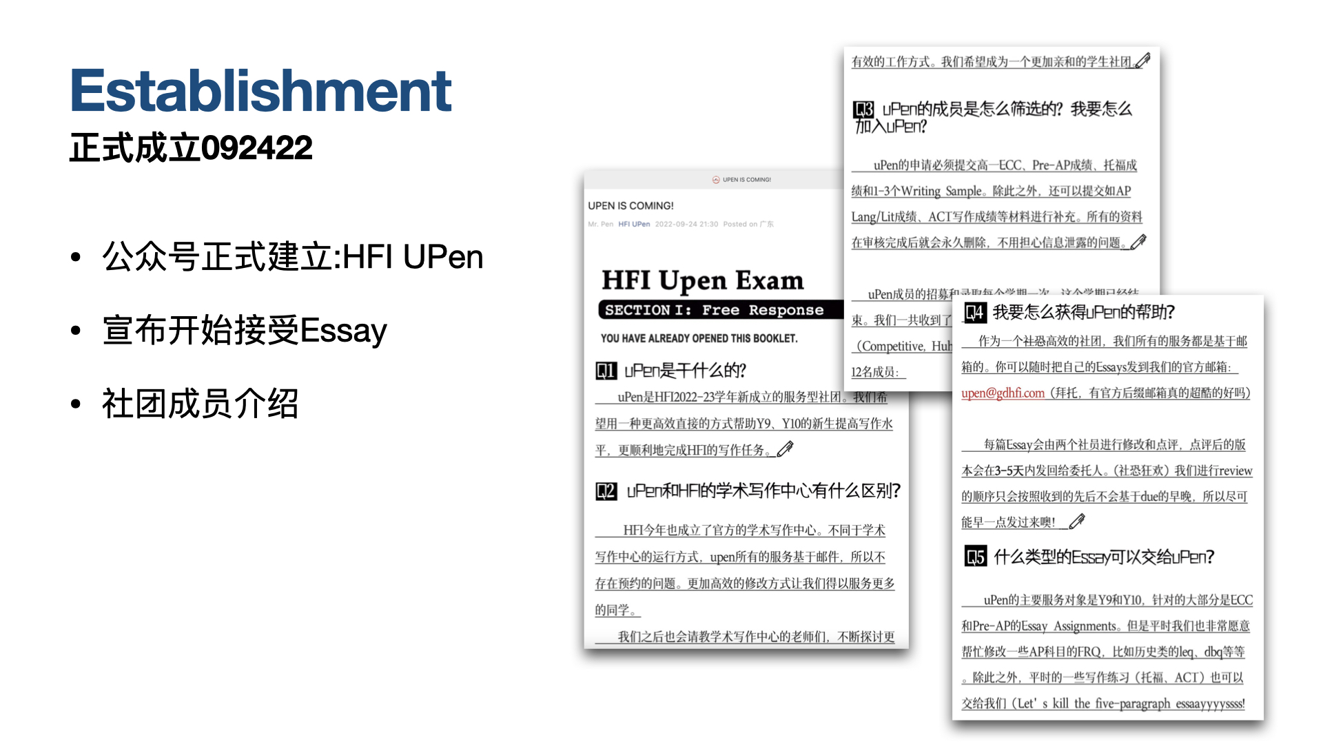 uPen是HFI的服务型社团,由擅长学术写作的Y11、Y12同学组成。作为曾经在各种essay中挣扎,反复咀嚼每个句子甚至单词的我们,希望可以为Y9、Y10新生带去最优的写作技巧与作文评价。不同于TA和学术写作中心的运营方式,我们运用邮件帮助Y9、Y10新生提高写作水平、顺利完成写作任务。高效直接的修改方式让我们服务众多同学,但我们也不断探索更稳定与直接的沟通方式,包括lectures等等。