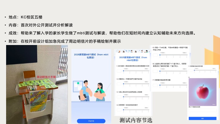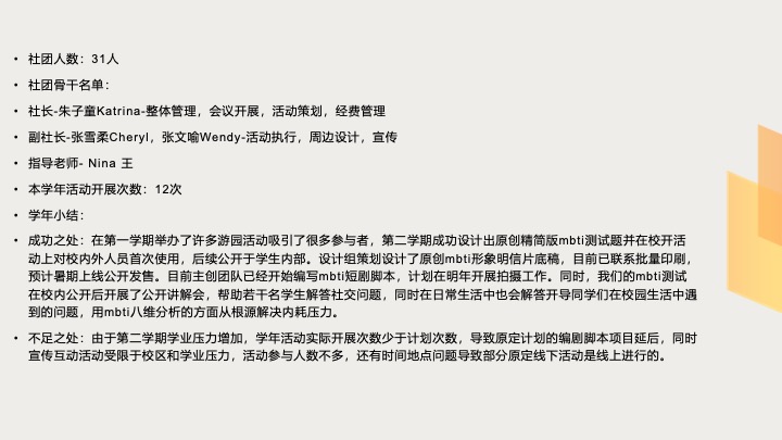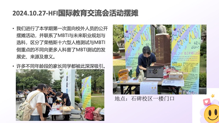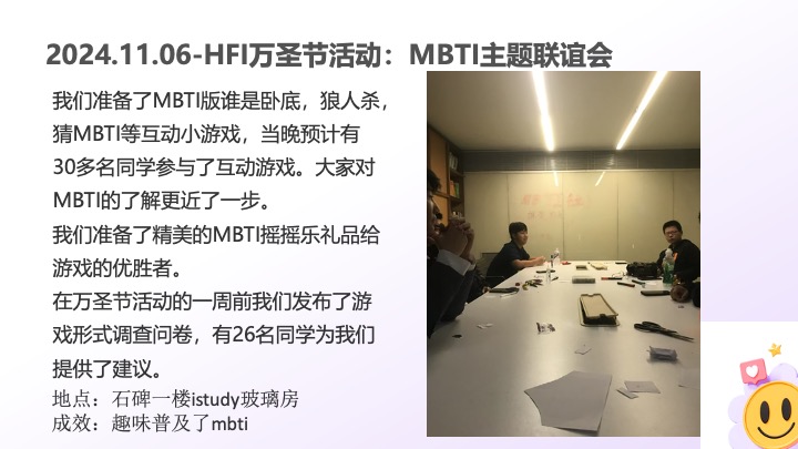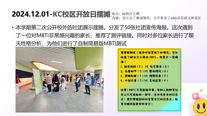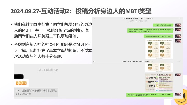 “E不做I不休”社社如其名,我们是一个疯狂的MBTI社。本社是以近期非常流行的性格职业测试MBTI测试为主题,为校园里各个角落的不知名生物所打造的一个交友平台。在本社团,我们可以尽情释放我们的天性,像烤面包一样膨胀自己,丰富自己,发掘自己的内心。我们的目标是带领各位在学习之外的时间发现更完整的自己,了解内心深处的自己,同时找到拥有统一志向和理想的战友。我们在通过一次次的测试与研究后,会更加了解有关心理思考思维及底层逻辑,有效缓解压力焦虑,从心理学角度娱乐放松,并找到真正热爱和适合你的方向与专业。在我们的社团中,你可以寻找一个令你舒适的社交方式,与同学们合作完成一些项目及有趣的活动。我们也会把不同性格的同学们聚集在一起,分析各自在未来适合与喜爱的职业岗位,并模拟未来的工作场合环境与人际关系,让大家在玩闹中体验职场中的“心眼子”和欢乐,同时展现自己的特长。让我们提前预演社会的险恶,让大家尽情享受在一起party的时光!