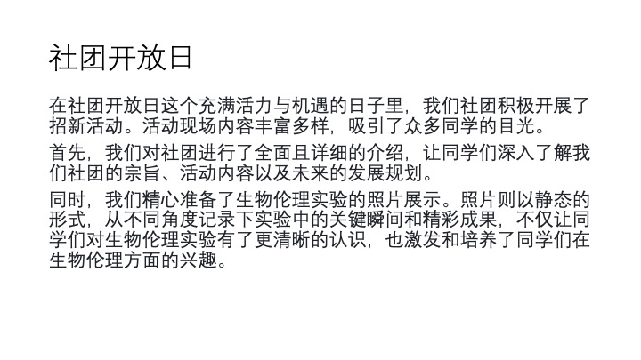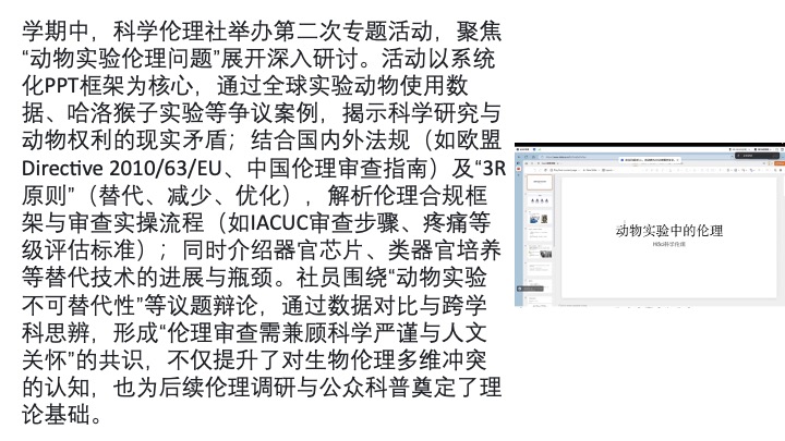 科学伦理社团旨在为同学们提供一个讨论科学伦理的平台,培养同学们的批判性思维和社会责任感。我们希望通过多样的活动和深刻的研究,帮助大家探索自己的兴趣,发现更多未来的专业方向。