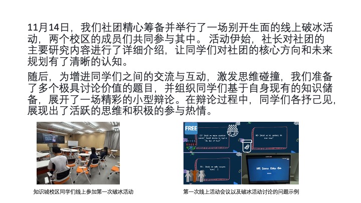 我们的活动形式多样,包括seminar、讲座、观看纪录片等,以丰富社团成员的学习体验。我们还将通过微信公众号发表文章,并制作视频记录seminar和进行科普,以便更广泛地传播我们的研究成果和讨论内容。
