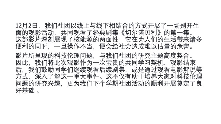 Our activities are diverse, including seminars, lectures, watching documentaries, etc., to enrich the learning experience of our members. We will also publish articles on our WeChat public account and produce videos to record seminars and conduct science popularization, in order to more widely disseminate our research findings and discussion content.