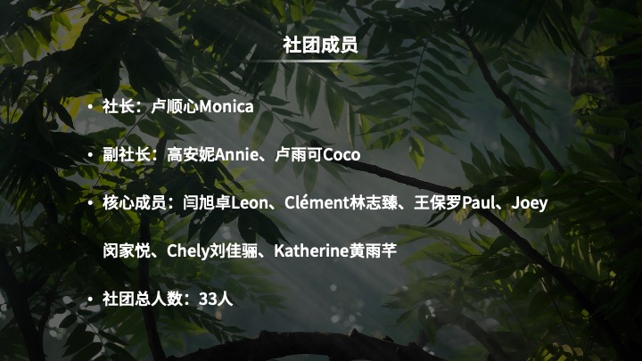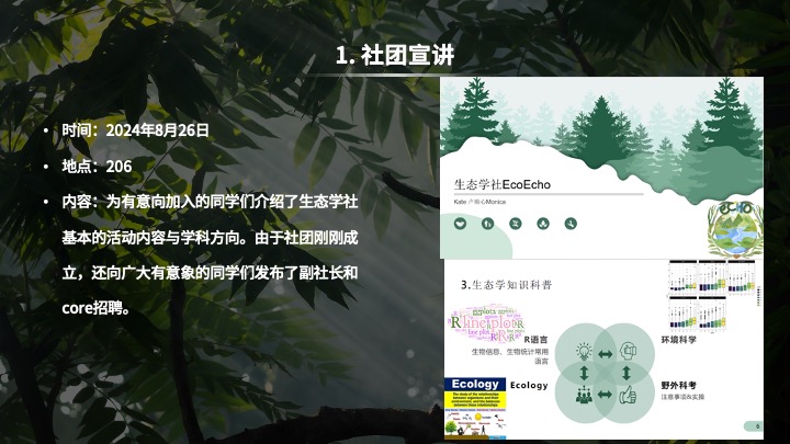 生态学社是一个致力于促进环保意识、可持续发展和生态保护的组织。我们热爱大自然,关注生物多样性、气候变化和环境可持续性,致力于通过教育、行动和倡导来实现更加清洁、绿色和健康的环境。