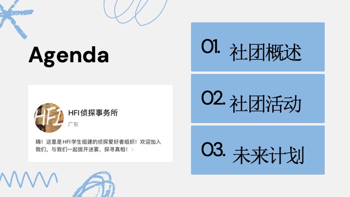 HFI侦探事务所旨在提供一个平台让对推理小说爱好者以及愿意培养爱好的人共同探讨、分析和体验推理小说所带来的刺激和快乐。社团的活动都以推理小说为主不会涉及悬疑相关的影视剧、动漫。通过相关讲座同学们了解有关推理小说的基础知识,制作属于社团的推理期刊。此外,还会举办“推理凶手”的活动,锻炼学生逻辑推理的能力。同时,计划与多所高校推理社进行交流学习。总而言之,此社团希望能丰富大家的日常,培养逻辑推理能力的同时感受到推理小说带来的乐趣。