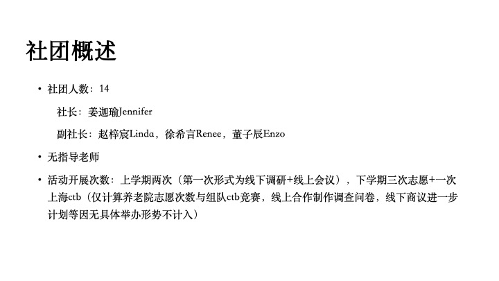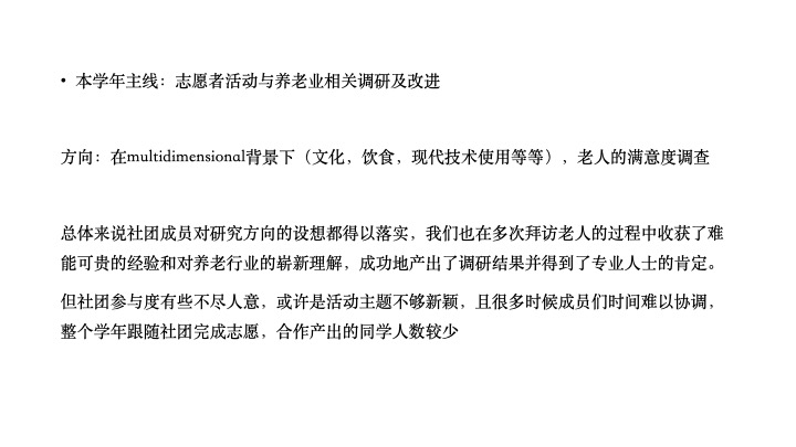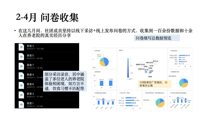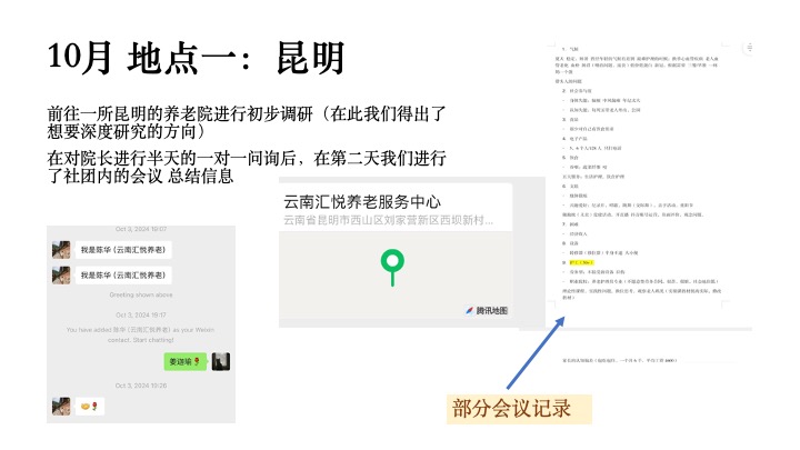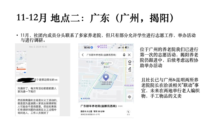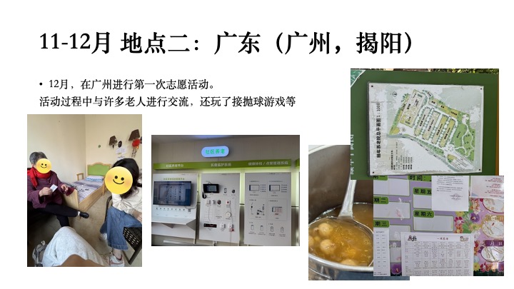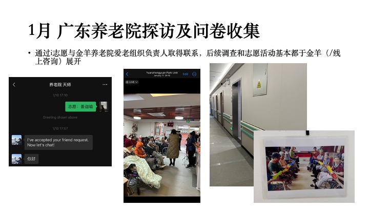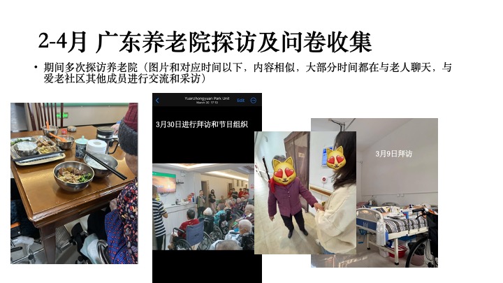 2. 定期前往敬老院/爱老社区进行活动(志愿服务,敬老业现存社会问题调研「both敬老工作者&老人」,根据调研结果设计能有助于改善情况的产品/宣扬正确理念的方式,具体形式大概有:prototype,实体,软件,宣传册,etc.
