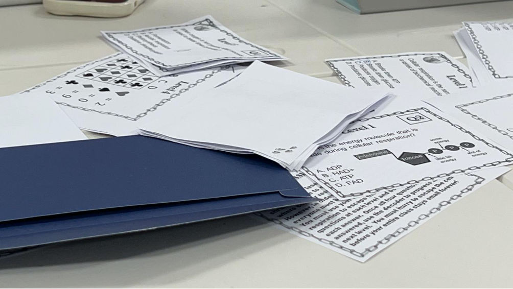 An envelope was dropped on each team's station, and a stack of multiple-choice questions was covered by a puzzle. In order to get the code for the runway, participants had to answer the questions about cells and decipher the four-digit code, then upload the answers on a given website. Students had to answer four stacks of questions in order to get the final key, though the first pack of questions was given directly to each group, the other three were hidden in the classroom. After digging and figuring out the code, and entering the website with shaking hands, all teams escaped successively!