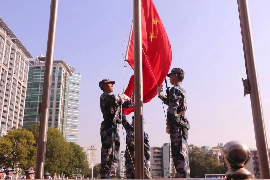 入场式表演结束后,在全体师生肃穆的注目礼中,鲜艳的五星红旗伴随着雄壮庄严的国歌冉冉升起。