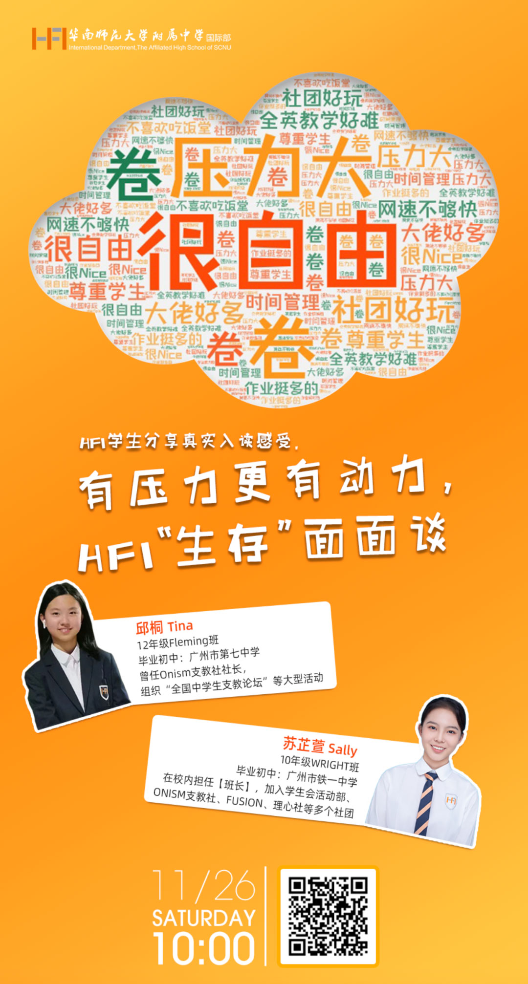 "HFI很自由,但peer pressure压力和考试也很多;社开(社团开放日)让我印象很深,感觉学长学姐们都很厉害很独立地去策划,还有同学们也很好!"