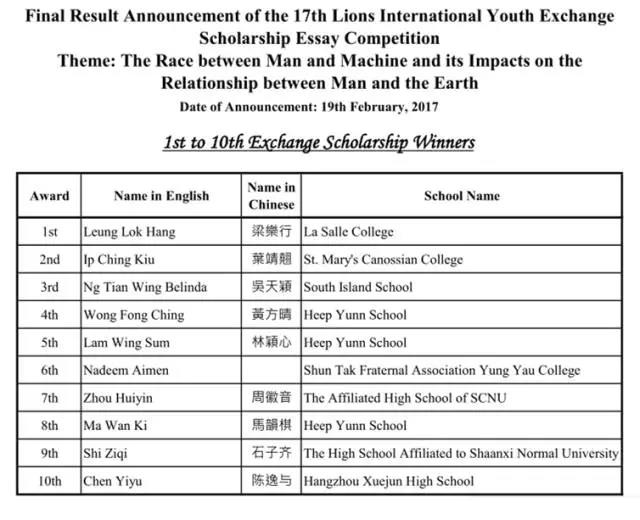 以上获奖学生可获得国际狮子总会中国港澳三〇三区推荐参加不同国家和地区的国际青年交流活动,与全球各地青年交流学习,前十名获奖学生可得到交流奖学金赞助。