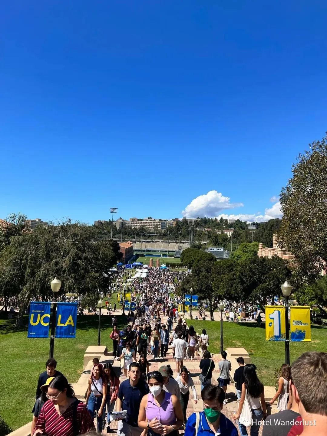 当然,体验赛事也是很重要的活动!橄榄球和篮球是最热门的,学生也需要买票的(女篮不需要买票)。其他体育赛事都可以免费看。每年最重大的便是跟“对家”USC的橄榄球赛,去年UCLA赢了,今年USC赢了。全场就是红蓝大作战哈哈哈哈,两个学生也会提前把校园的雕像包起来防止破坏。