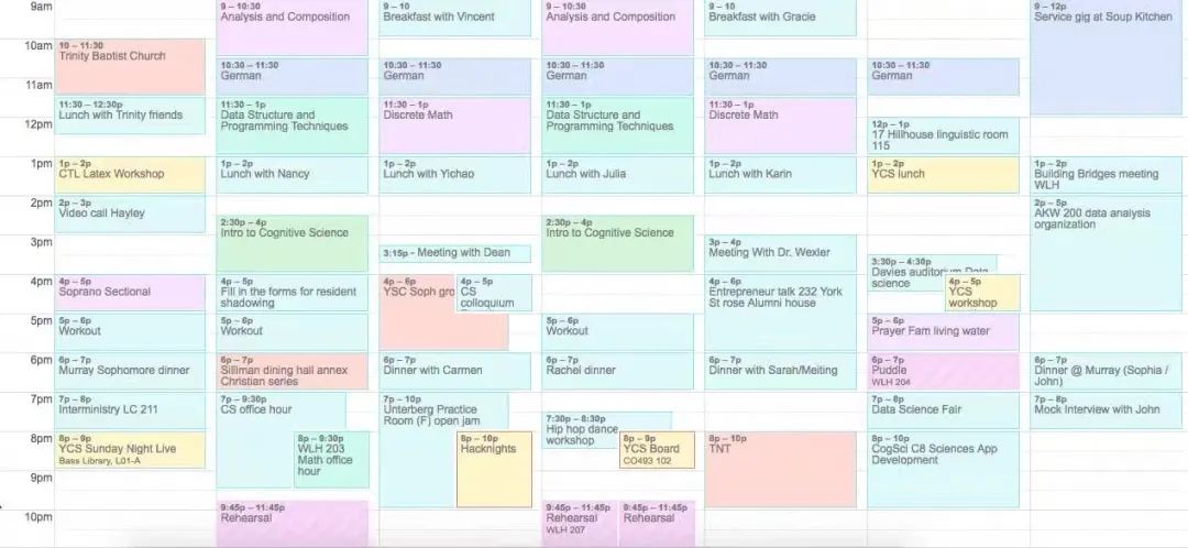 活动上,校园内外的活动实在是太丰富了,而Sophia又“什么都想要”,几乎所有她感兴趣的活动都会去参加,时间被安排的满满当当,甚至连和同学约饭,都要提前两周的时间预约,并且还要发送邮件给同学以提醒约饭日程。
