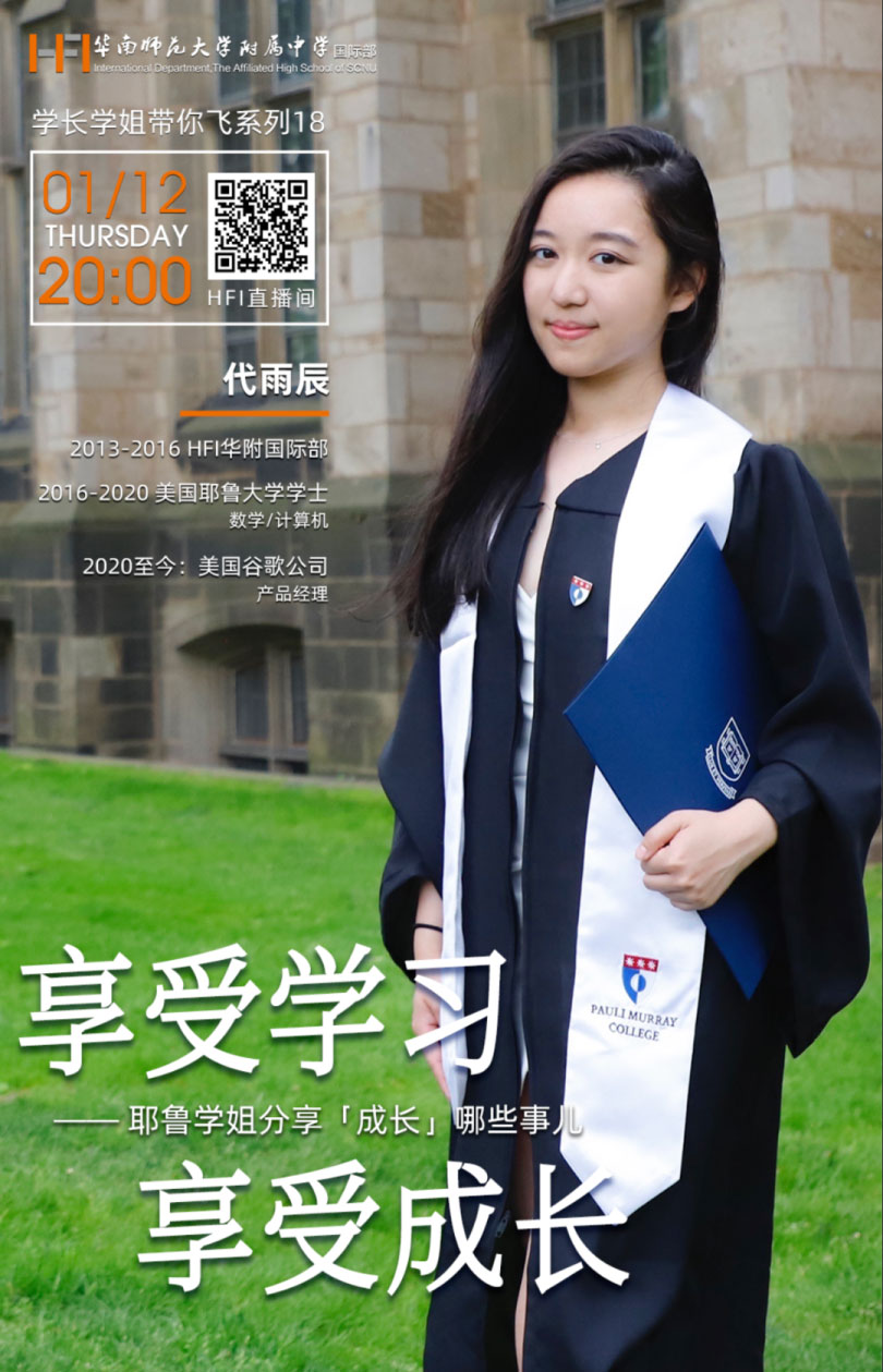 Hi!我是代雨辰,HFI 2016届的毕业生,耶鲁大学本科数学计算机专业,现美国谷歌产品经理。同时,我也是一个Life Coach(生活教练),致力于帮助高中生/大学生更深层次了解自己,激发潜能,突破困境,改善学习生活并实现理想目标。