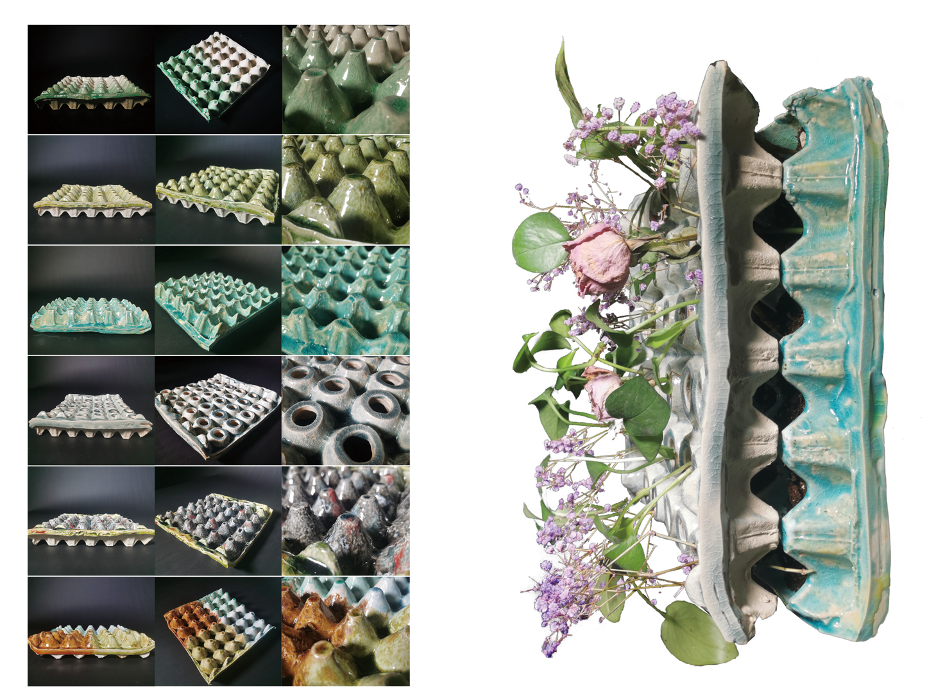 从中受到启发,我就通过注射成型制造了两个陶瓷蛋盘,并从它的空心中铺设土壤来种植植物。这一概念可以应用于墙体结构,也是这个项目与自然融合的第一次探索。