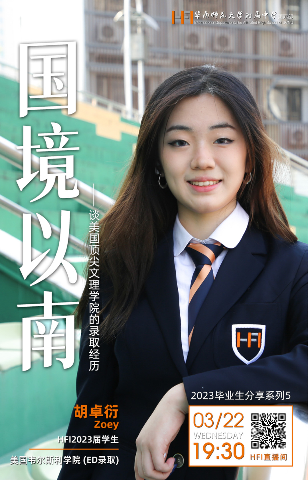 在今年的海外大学早申中,美国顶尖私立女校Wellesley College(韦尔斯利学院,也称卫斯理女子学院)再度向HFI学子伸出橄榄枝。3月22日周三晚七点半,胡卓衍将在HFI直播间与大家一起分享她与Wellesley的结缘经历以及她的成长故事。
