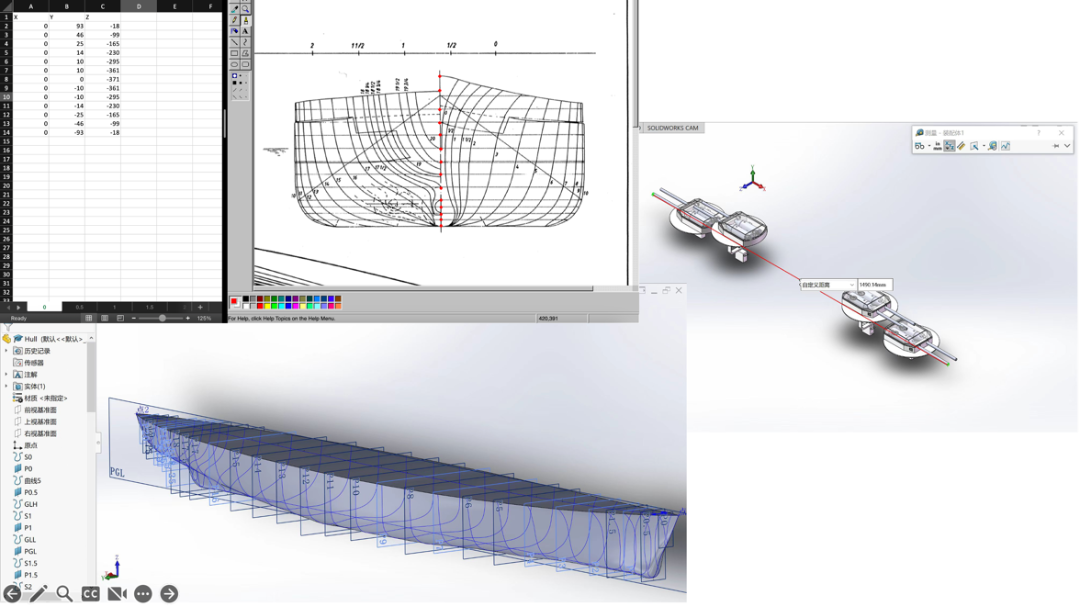 MAKERs’早期自信的底气源于我们不靠科班出身、全凭自己走野路子整活起家的经历,有不会的东西上网总能扒到,因为二十一世纪的新青年对着一台跨上信息快速路的计算机大叫不知道怎么办实在丢人。比如我们的船模项目,网上扒现成的模型没有适合需求的那就自己搓。为此我了解到造船会涉及的一项关键资料叫型值表(Table of Offsets),其中记载一型船体若干水平剖线和纵向剖线交点的坐标,把这个表格导入到建模软件里构成草图引导线和截面图形就能够放样拉出船体。查资料发现想要的船体型值表存在某国档案馆里($69.00),但蓝图满大街都是,于是我就把蓝图截屏放到画图(对,就是小学三年级信息技术学的)里,把每一个点标红的同时记录显示的像素坐标,有空就录几个点,聚沙成塔般自己搓了一份型值表建成船模。
