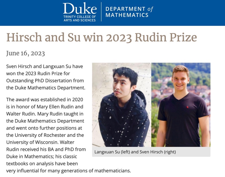 Rudin prize是杜克数学系的年度最佳博士论文奖,是为了纪念美国杰出数学家Walter Rudin和Mary Ellen Rudin。卢丁奖虽然历史不长,但却代表了每年杜克大学数学系博士论文的最高水平。2023年卢丁奖由苏朗轩和Sven Hirsch共同获得。