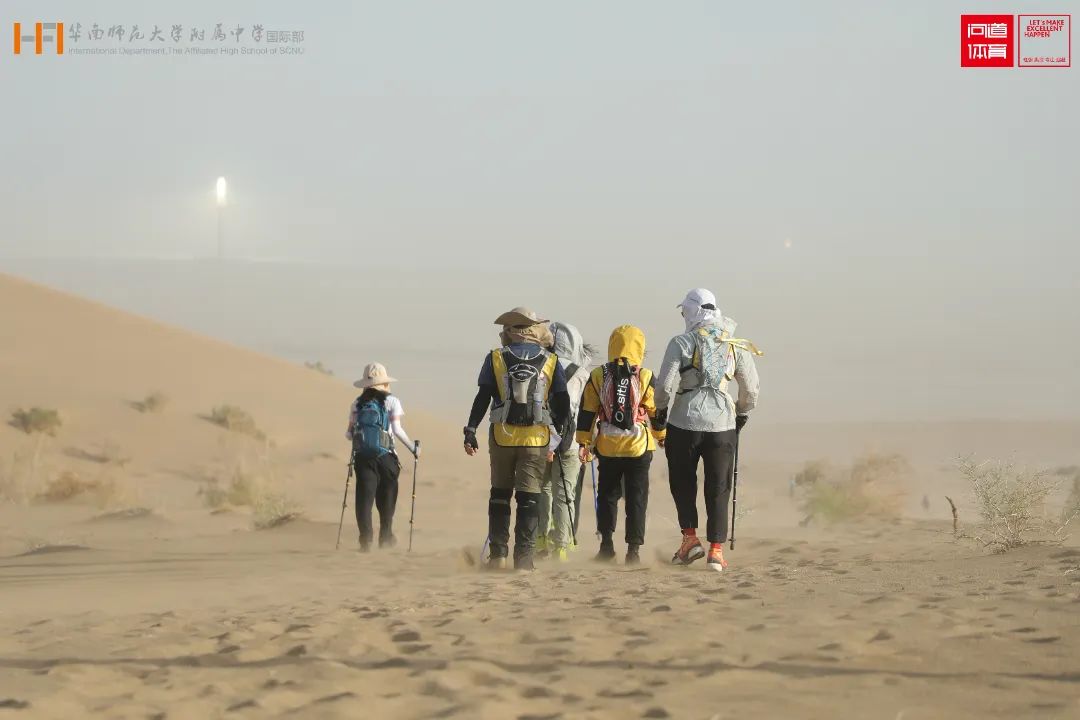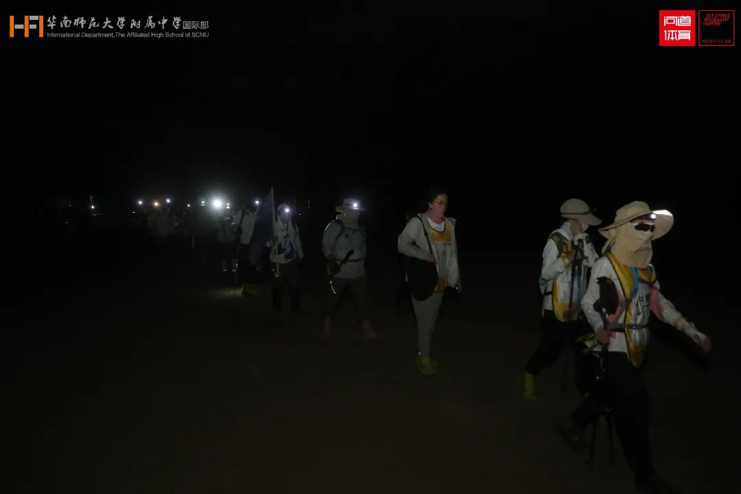 四点的闹钟,我醒了,帐篷外面很黑很黑。由于天气原因夜空的星星并未现身,确实可惜,不过再想想,沙漠之中的雨水又何尝不是罕见的、珍贵的呢。最后一天,我们从黑夜出发,踏向早晨第一片云彩。队伍很安静,除了防沙鞋套与沙粒摩擦的响声和队旗被风吹动的声响,只有一群人对自己的灵魂拷问。