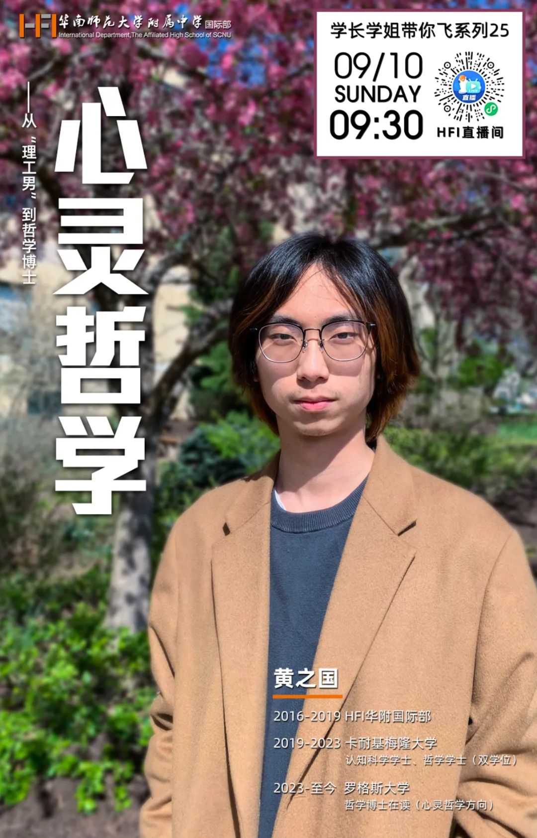 黄之国对于探索未知事物的热情,对于自我的认知,都将他导向了一条更适合的道路。9月10日(周日)上午9:30,新一期的【HFI校友分享】,我们邀请2019届毕业生黄之国来分享他的成长故事。