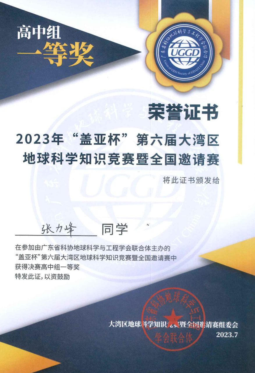 本次大湾区地球科学知识竞赛暨全国邀请赛决赛分景区科考和纸笔考试两个部分,不仅考察前期的知识储备,还有现场的学习能力,以及野外科考的体力和团队纪律,张力峰同学通过重重考验,最终获得了一等奖的骄人成绩。