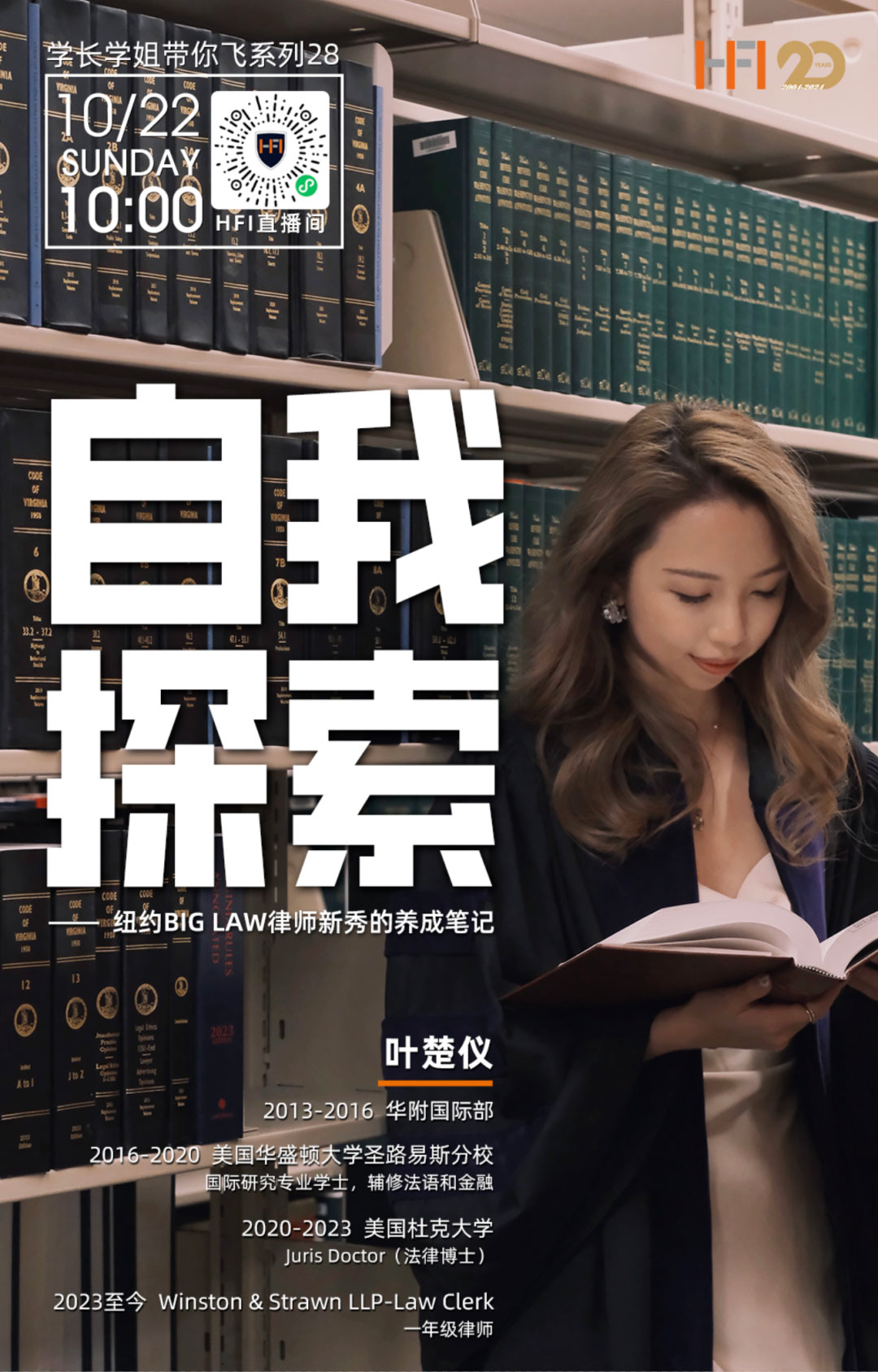 本期校友分享的嘉宾叶楚仪Linda,就是一位通过重重难关,进入到美国顶级律师事务所工作的正式律师,10月22日(周日)上午10:00,她将会为我们分享从HFI毕业生,到美国律师新秀的成长之路。