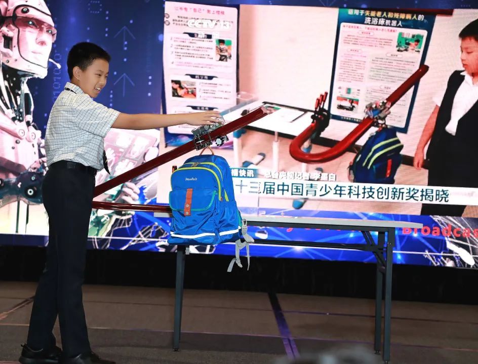 其中,我校初一5班胡东平同学的项目《帮助学生书包爬楼梯的减重机器人》获得主舞台路演的机会。