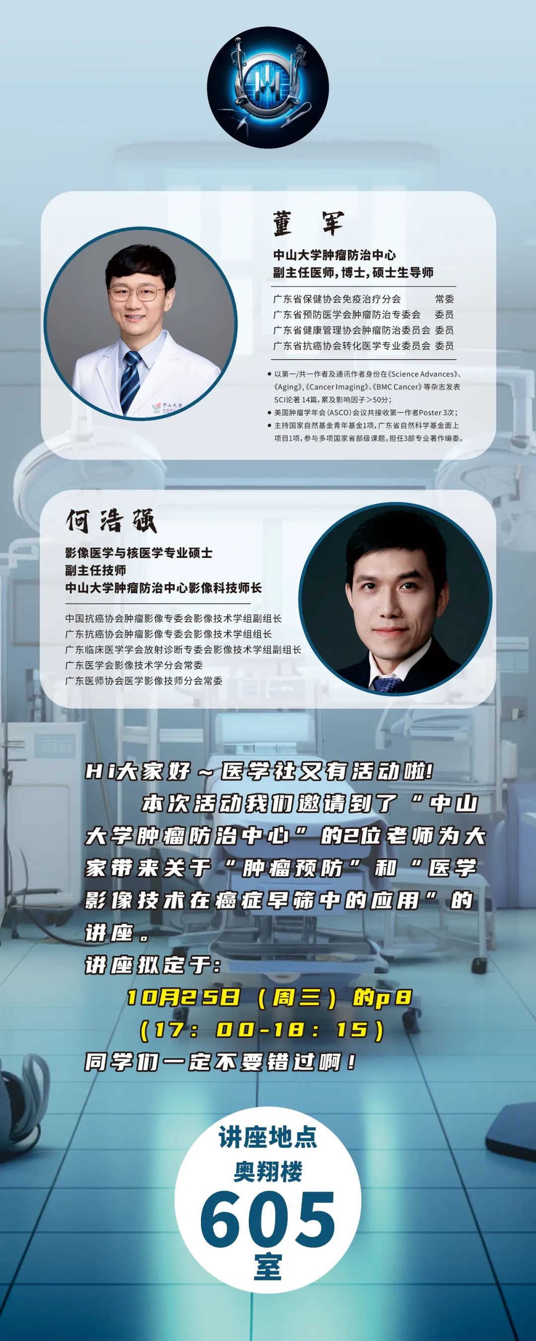 地点:奥翔楼605室 关于HFI医学社:HFI医学社旨在培养学生对于医学的兴趣,增强学生自我保护能力,提高学生面对紧急情况的科学应对能力。通过医学实验,解刨实验,专家讲座,让学生在享受医学的熏陶中也不断发展相关学术能力,并且能让学生更好地了解医疗职业的不同领域和职责,从而更好地规划自己的职业道路。同时,HFI医学社也是一个为学生提供交流互动的平台,有助于建立友谊,分享学术和实践经验。