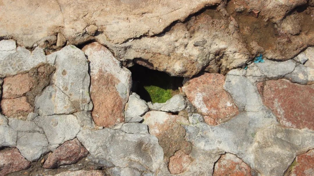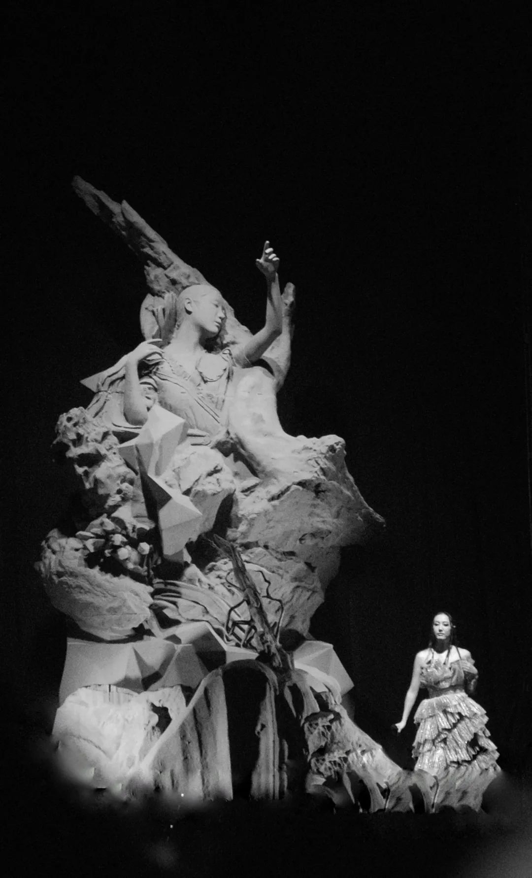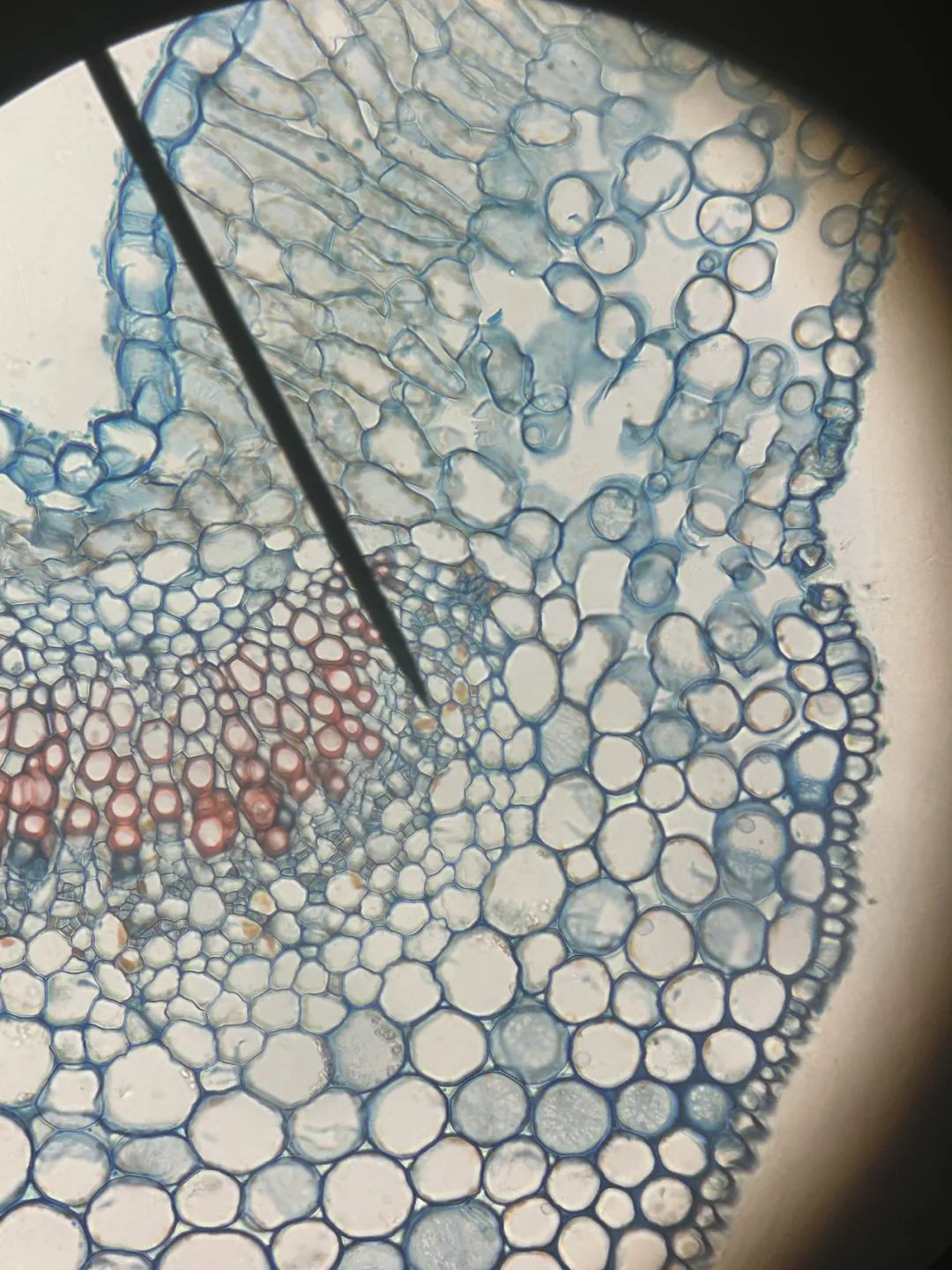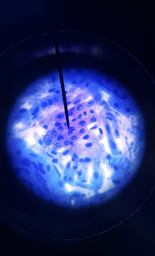 这是一张显微镜照片,定位针指向一个停留在有丝分裂中期的细胞。浅蓝的光晕将紫色的聚光灯簇拥在中间,一个生命的单位在舞台中央创造下一个。