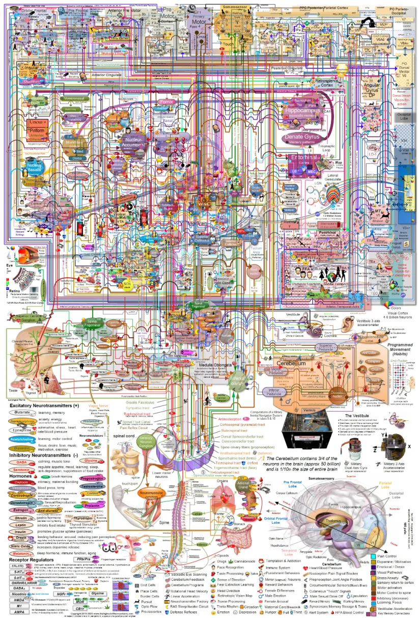 这张“牛逼的图片”一直都呆在我的电脑桌面上,这是我目前见过最完整的brain mapping海报, 闲来无事时我总会点开来膜拜膜拜,我曾暗下决心要弄懂图中的每一条线和每一个词(甚至连高三选课CSA都是为了看懂旁边的Neuronal Dynamics才选的)。