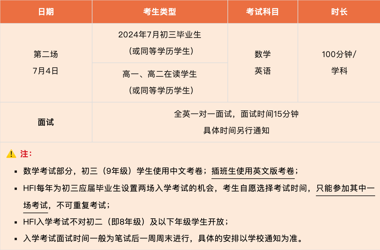 HFI华附国际部2024年首场入学考试已于4月结束,最后一场入学考试报名通道已开启。今年招录模式仍然按照往年形式进行,仍然将入学考试成绩(笔试+面试)和中考成绩(中考生)作为招生评估标准,择优录取。