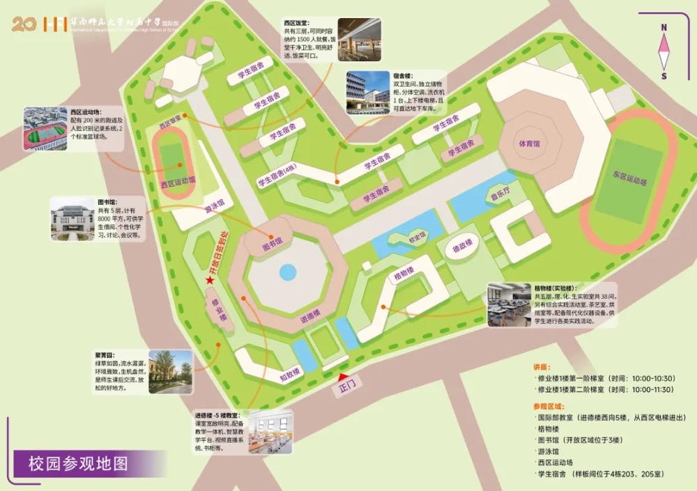 09:30-10:00 签到/领取校园地图/购买饭票:修业楼一楼右侧10:30-12:00 校园参观(老师带队):国际部教室/图书馆/宿舍/体育场/游泳馆/饭堂