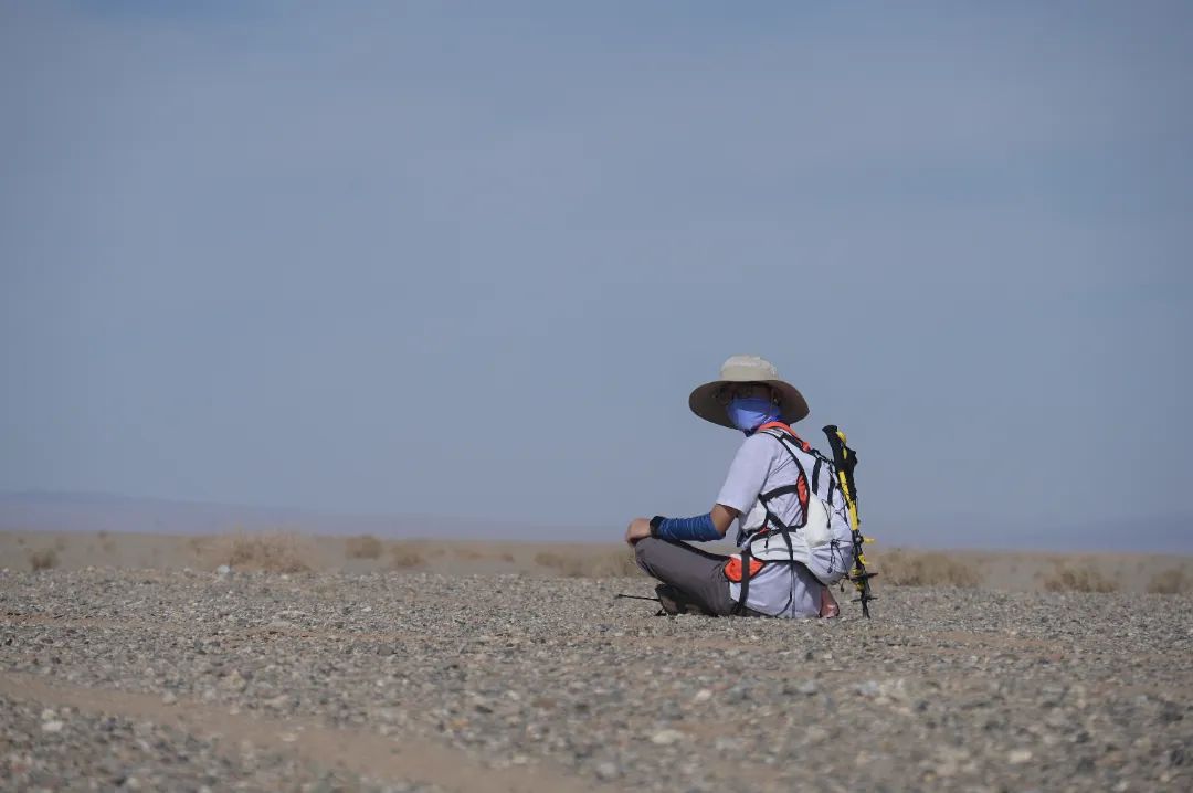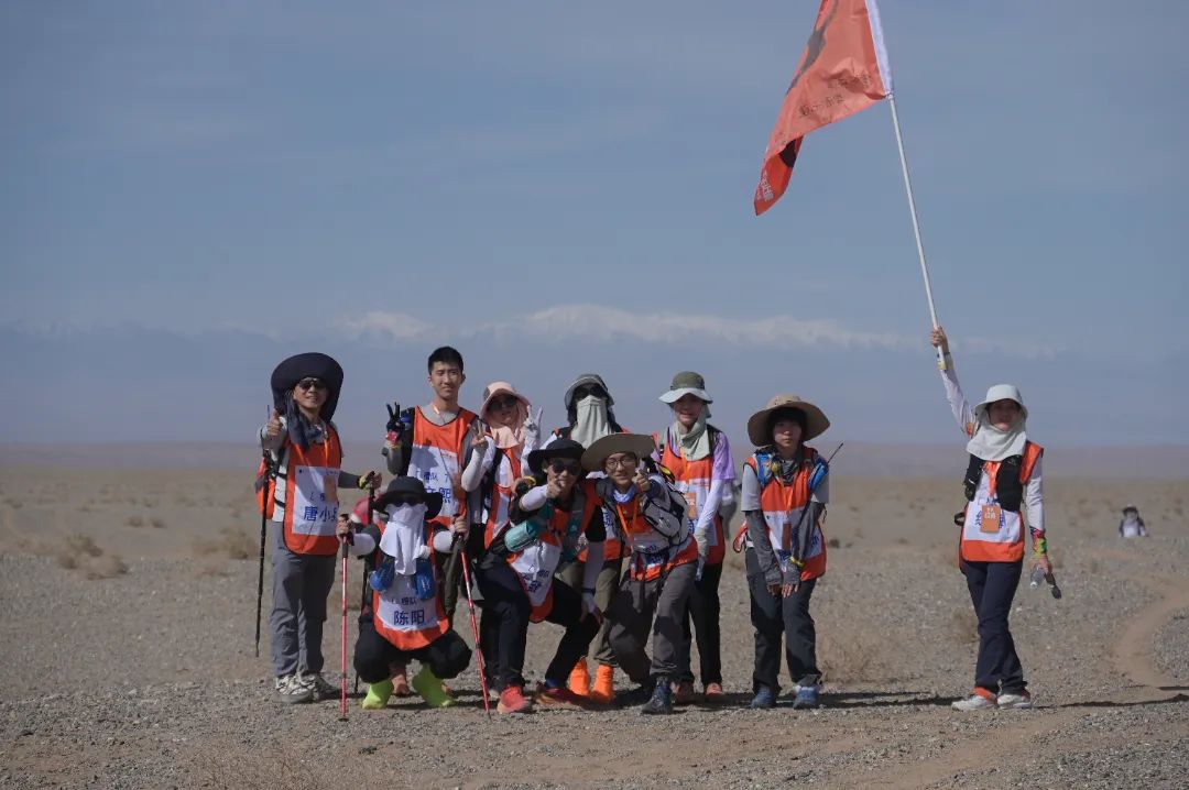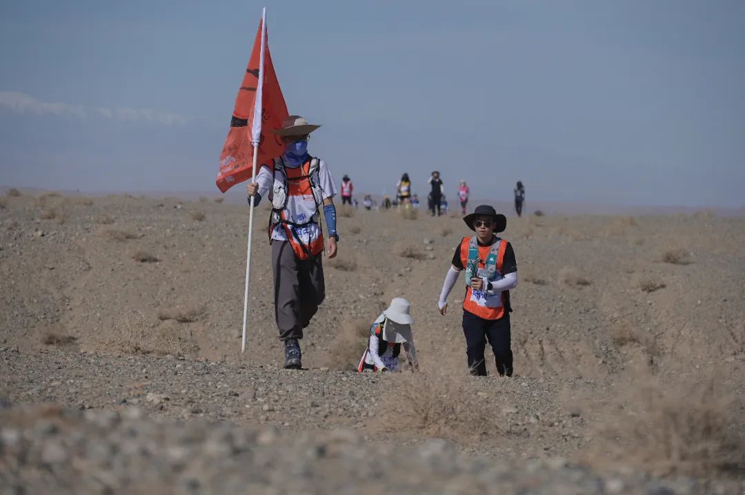 每当头阵到打卡点,队员们随时透过对讲机与后方梯队保持联系,确认后方梯队经过旗帜位置,以确保一旦人数到位,任务即刻完成。“众志成城,无征而不摧。”我们团队精神在戈壁上蔚为壮观。此互助形式,正是团队精神之体现,同时也是我们持续前进之推动力。
