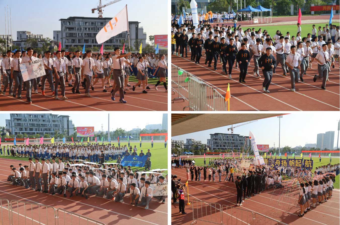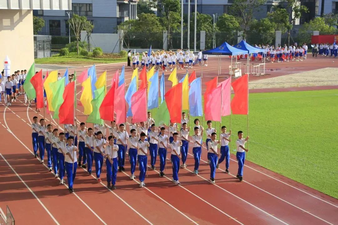 按惯例,开幕式的第一只队伍,是由华附海航学子组成的校旗方阵,随后进场的则是由知识城校区首届国际班组成的彩旗队,他们的入场拉开了校运会的序幕。