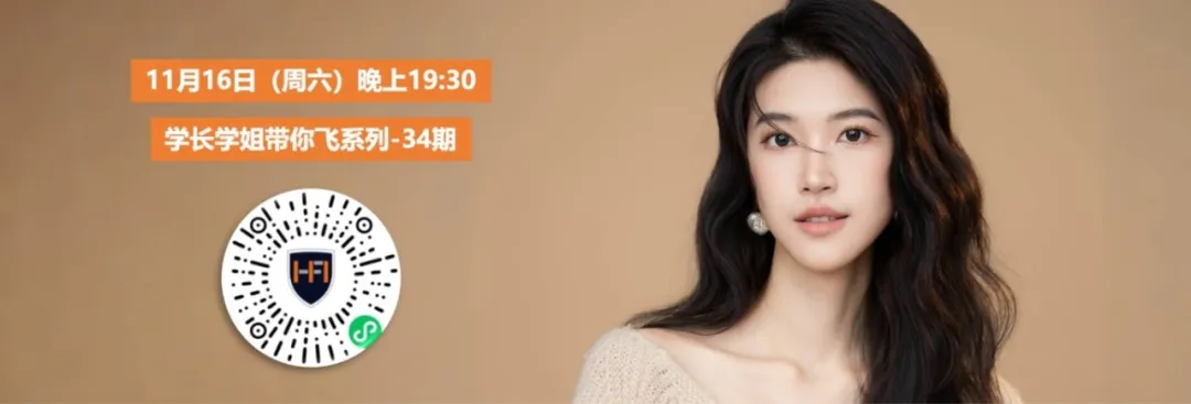佳颖学姐近十年的美国求学工作经历不是这一个小时的线下分享中能够说完的,因此11月16日晚上19:30的HFI直播间中,我们会再续前缘,请佳颖学姐分享她的美国求学工作经历2.0。