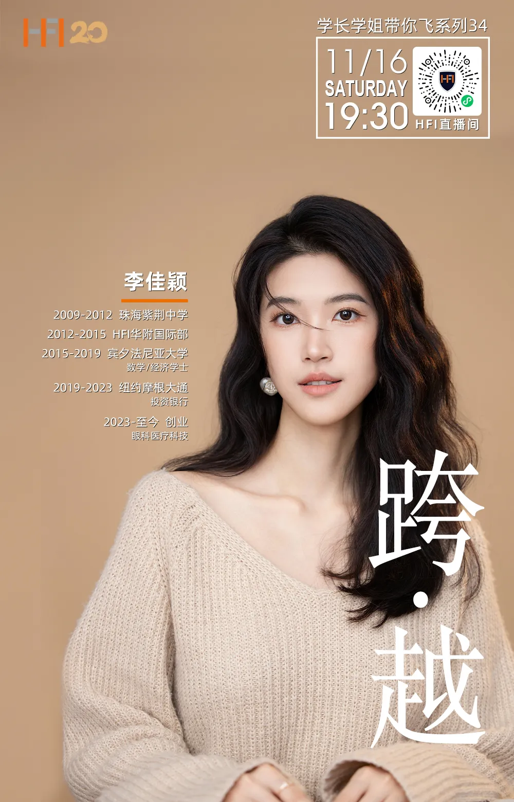 昨天,我们有幸邀请到佳颖学姐在华附知识城校区为2024级新生们进行了一次分享,而在11月16日(周六)晚上19:30,佳颖学姐将再临HFI直播间,分享她在美国求学、工作的经历。