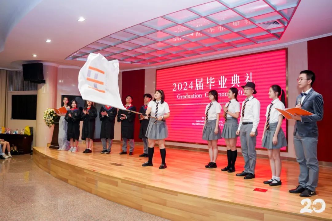 ▲每年毕业典礼上,12年级学长学姐都会将象征HFI精神的旗帜传给学弟学妹