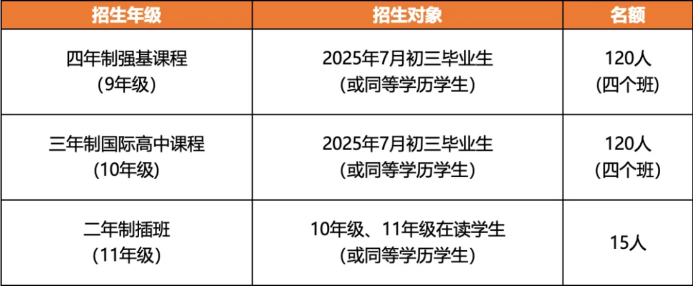 三年制及四年制课程,欢迎志存高远的优秀初三学生及同等学历的学生(如:国际课程体系IGCSE课程G1, IB课程Pre-DP1,海外高中9年级学生等)积极报考;学籍、户籍不限;