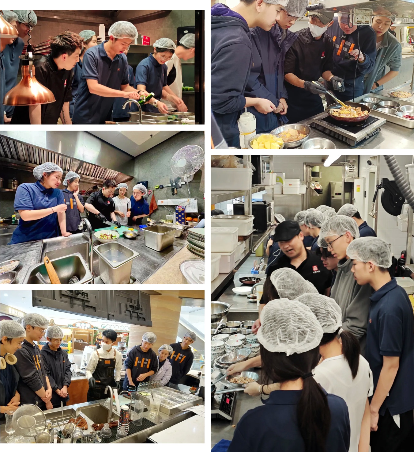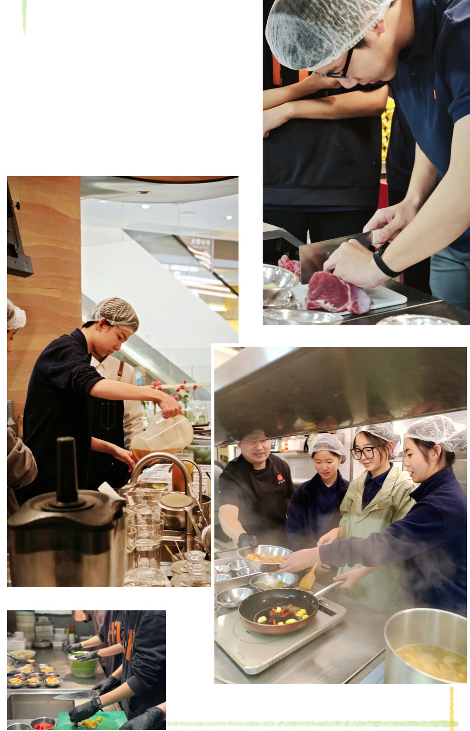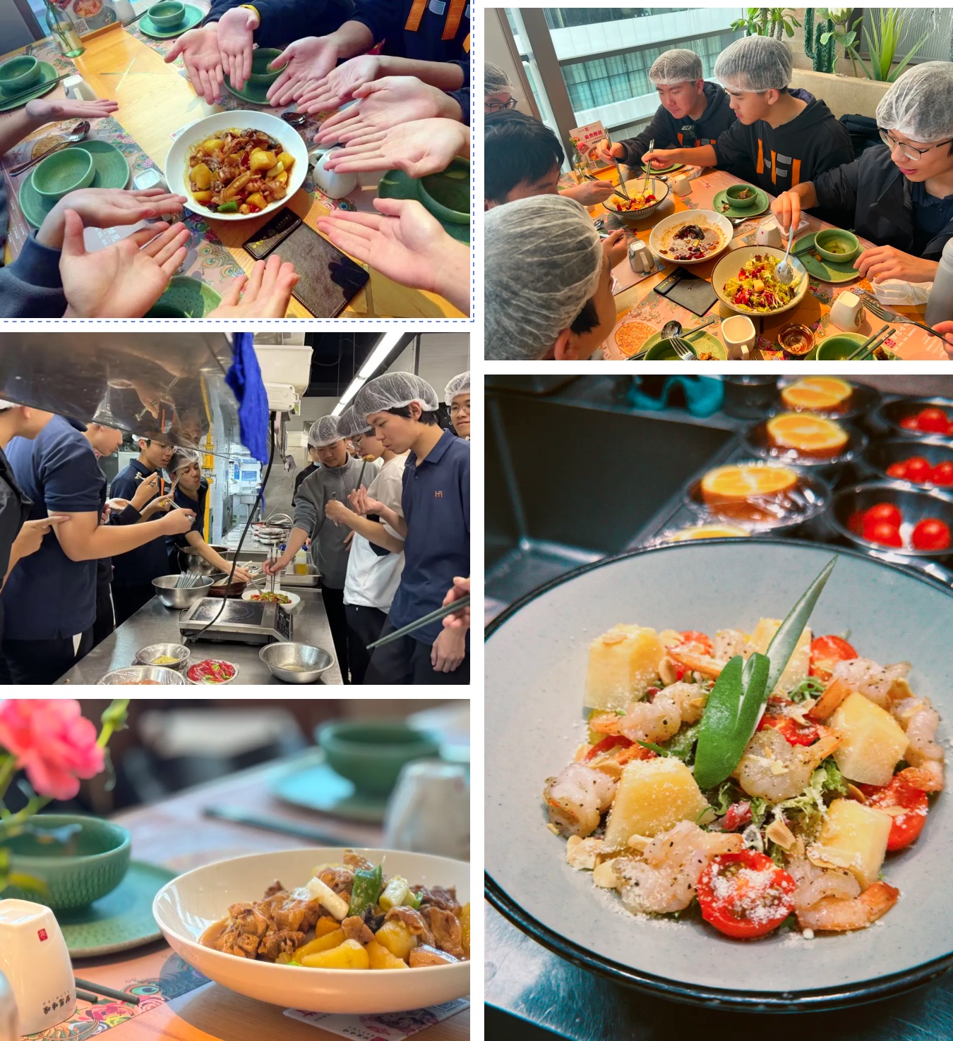 HFI食艺课程以学生动手操作为主,由各班班主任确定分组及小组长名单(小组成员推选,负责组内分工和卫生、刀具使用等安全管理)、宣传委员人选(负责以照片、视频等形式记录班级“精彩食刻”),上课时先由大厨示范操作,学生们观摩后再在指导下亲自上阵操作。每组学生需要完成1道主菜+1道凉菜+个人份饮品,完成点评后,于小组餐桌品尝亲手制作的美食。