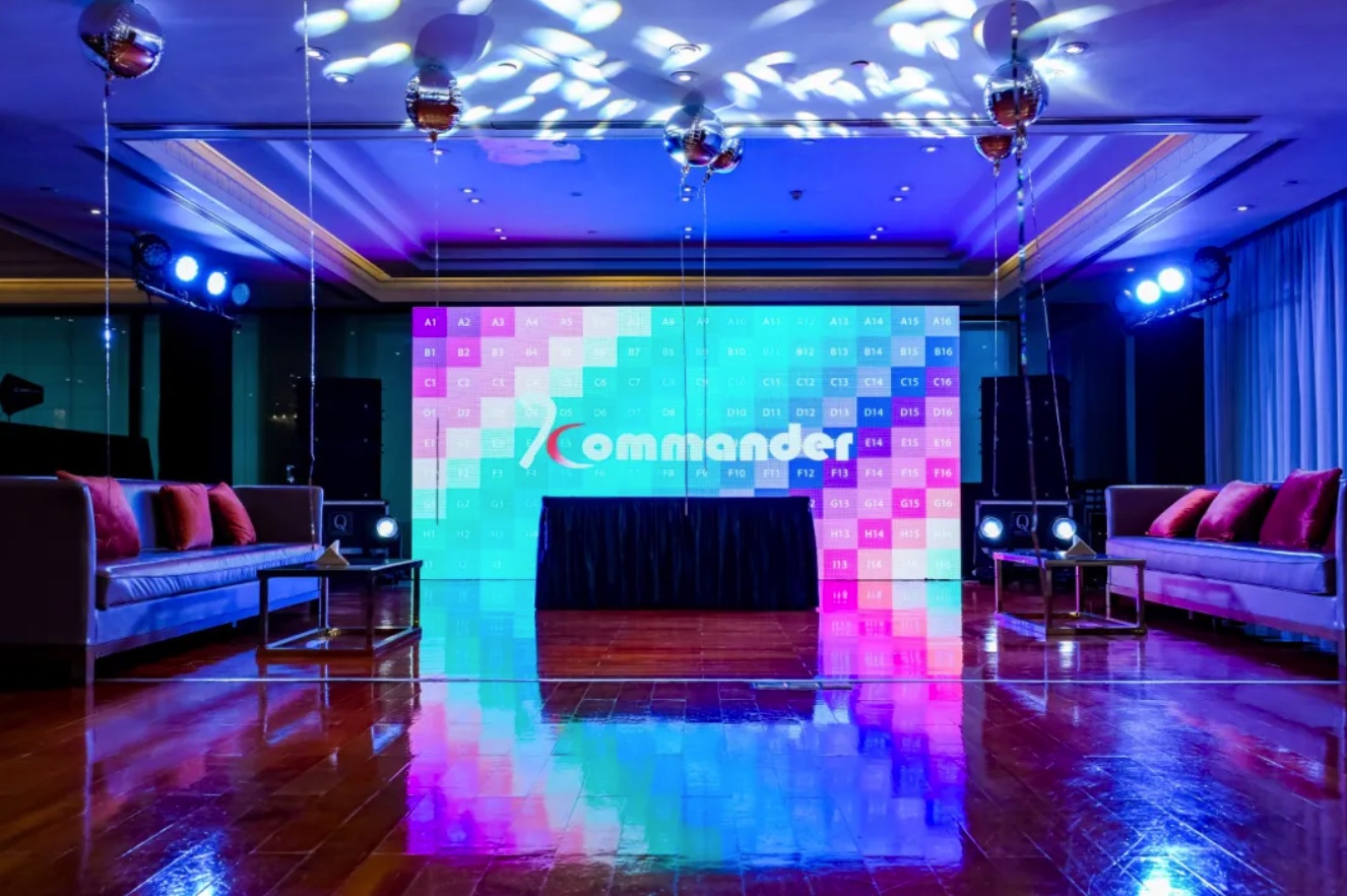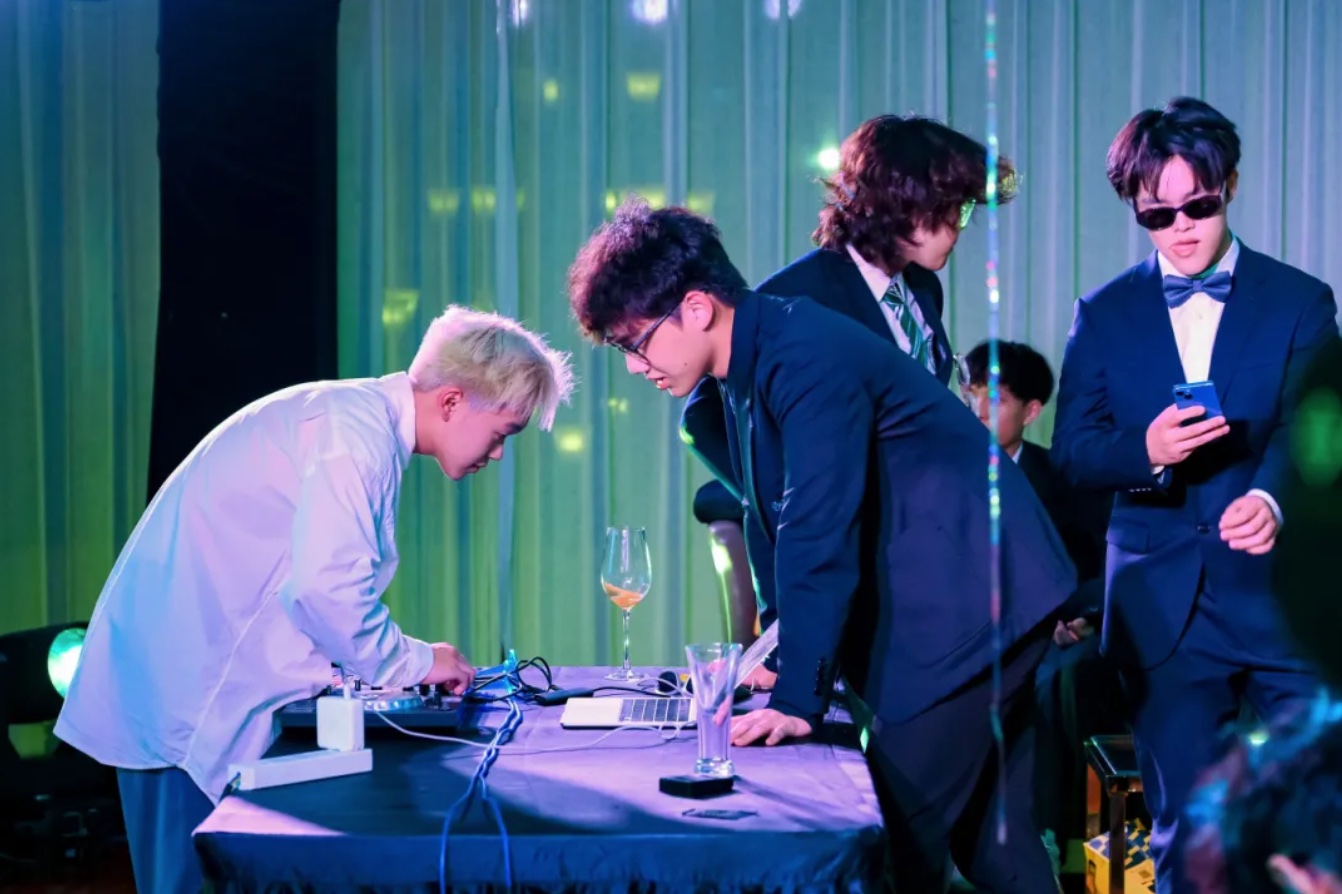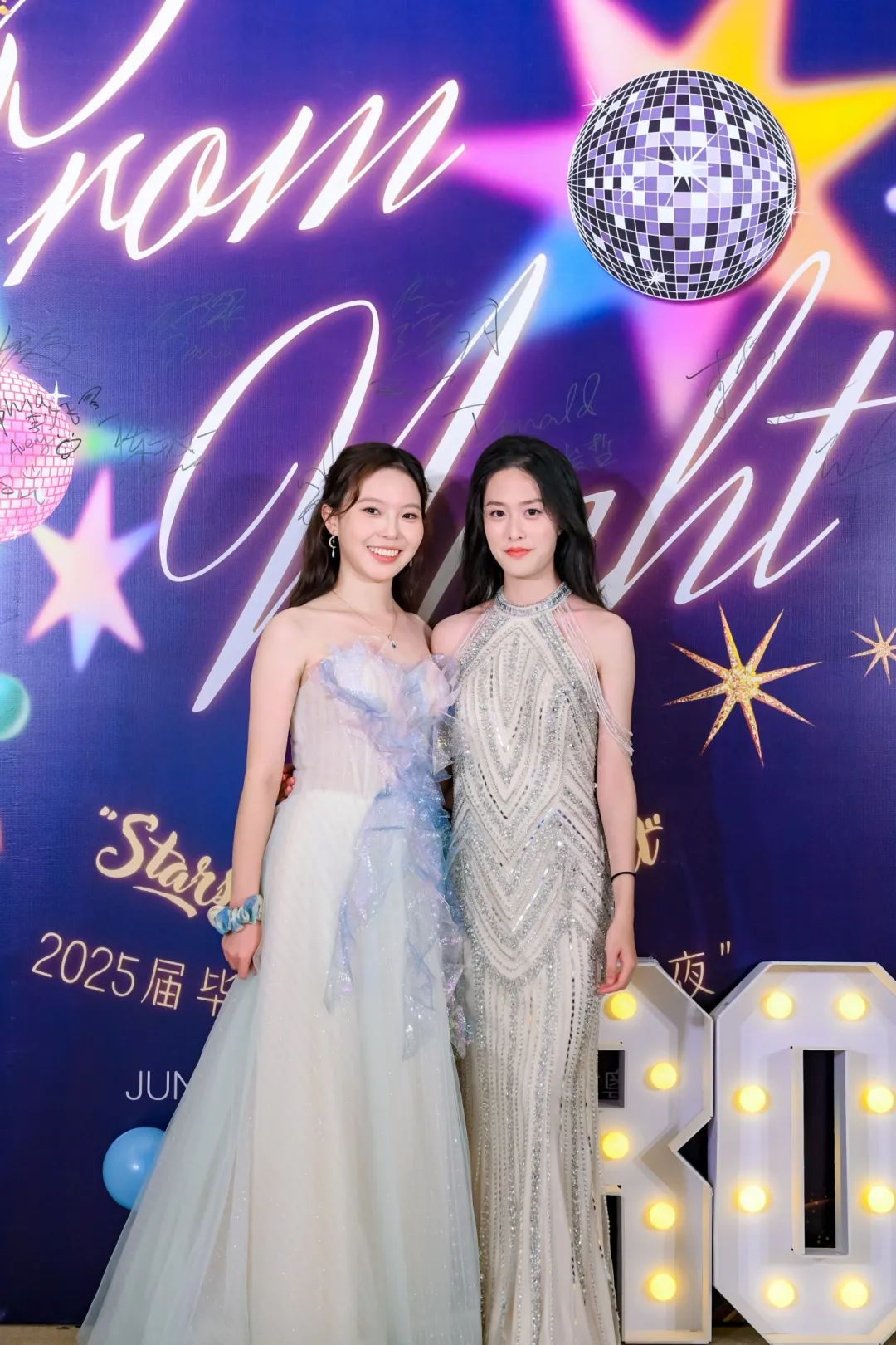由2025届毕业生自主策划、组织和执行的毕业舞会“星光璀璨夜”在当晚上演:色彩斑斓的星空,桌台摆放着假面,礼服与西装取代了白天的礼服和学位袍。
